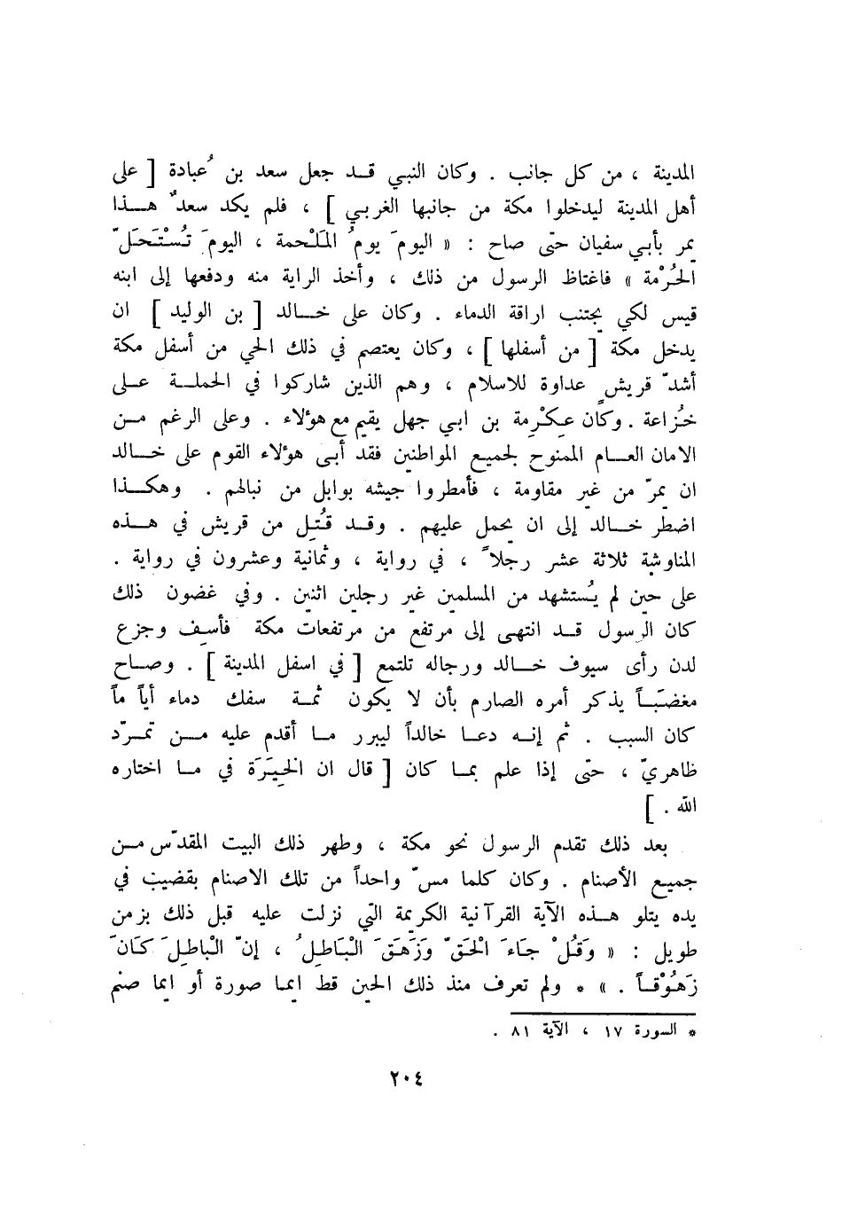 المدينة، من كل جانب. وكان النبي قد جعل سعد بن عبادة [على أهل المدينة ليدخلوا مكة من جانبها الغربي] ، فلم يكد سعد هذا يمر بأبي سفيان حتى صاح: «اليوم يوم الملحمة، اليوم تستحلّ الحرمة» فاغتاظ الرسول من ذلك، وأخذ الراية منه ودفعها إلى ابنه قيس لكي يجتنب اراقة الدماء. وكان على خالد [بن الوليد] ان يدخل مكة [من أسفلها] ، وكان يعتصم في ذلك الحي من أسفل مكة أشدّ قريش عداوة للاسلام، وهم الذين شاركوا في الحملة على خزاعة. وكان عكرمة بن ابي جهل يقيم مع هؤلاء. وعلى الرغم من الامان العام الممنوح لجميع المواطنين فقد أبي هؤلاء القوم على خالد ان يمرّ من غير مقاومة، فأمطروا جيشه بوابل من نبالهم. وهكذا اضطرّ خالد إلى ان يحمل عليهم. وقد قتل من قريش في هذه المناوشة ثلاثة عشر رجلا، في رواية، وثمانية وعشرون في رواية.