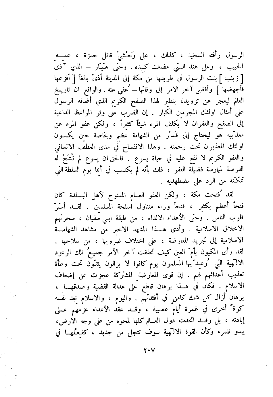 الرسول رأفته السخية، كذلك، على وحشيّ قاتل حمزة، عمه الحبيب، وعلى هند التي مضغت كبده. وحتى هيّار- الذي آذى [زينب] بنت الرسول في طريقها من مكة إلى المدينة أذى بالغا [أفزعها فأجهضها] وأفضى آخر الامر إلى وفاتها- عفي عنه. والواقع ان تاريخ العالم ليعجز عن تزويدنا بنظير لهذا الصفح الكريم الذي أغدقه الرسول على أمثال اولئك المجرمين الكبار. إن الضرب على وتر المواعظ الداعية إلى الصفح والغفران لا يكلف المرء شيئا كثيرا، ولكن عفو المرء عن معذّبيه هو ليحتاج إلى قدر من الشهامة عظيم وبخاصة حين يكون اولئك المعذبون تحت رحمته. وهذا الانفساح في مدى العطف الانساني والعفو الكريم لا نقع عليه في حياة يسوع. فالحق ان يسوع لم تتح له الفرصة لممارسة فضيلة العفو، ذلك بأنه لم يكتسب في أيما يوم السلطة التي تمكّنه من الرد على مضطهديه.
