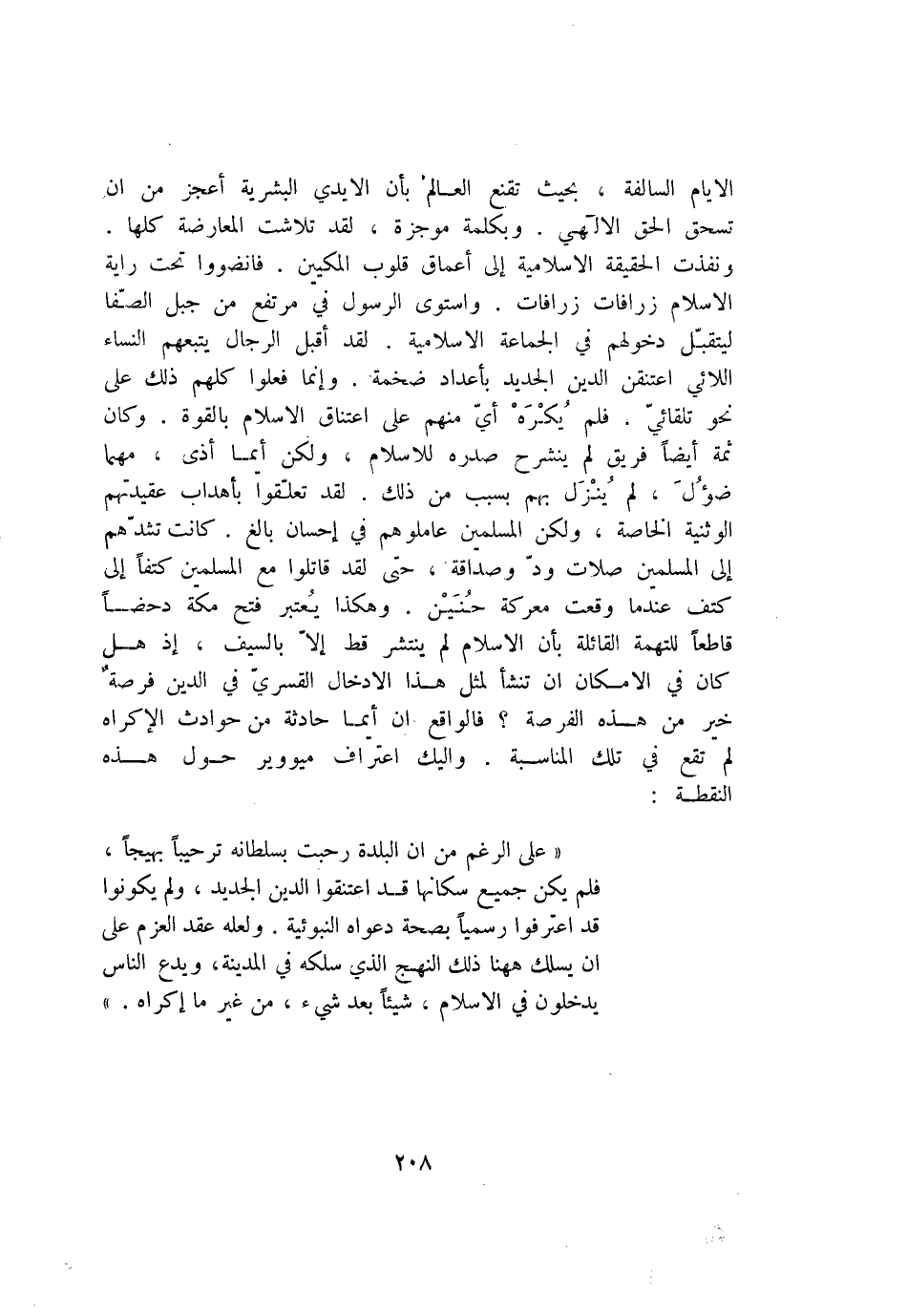 ونفذت الحقيقة الاسلامية إلى أعماق قلوب المكيين. فانضووا تحت راية الاسلام زرافات زرافات. واستوى الرسول في مرتفع من جبل الصّفا ليتقبّل دخولهم في الجماعة الاسلامية. لقد أقبل الرجال يتبعهم النساء اللائي اعتنقن الدين الجديد بأعداد ضخمة. وإنما فعلوا كلهم ذلك على نحو تلقائيّ. فلم يكره أيّ منهم على اعتناق الاسلام بالقوة. وكان ثمة أيضا فريق لم ينشرح صدره للاسلام، ولكن أيما أذى، مهما ضؤل، لم ينزل بهم بسبب من ذلك. لقد تعلّقوا بأهداب عقيدتهم الوثنية الخاصة، ولكن المسلمين عاملوهم في إحسان بالغ. كانت تشدّهم إلى المسلمين صلات ودّ وصداقة، حتى لقد قاتلوا مع المسلمين كتفا إلى كتف عندما وقعت معركة حنين. وهكذا يعتبر فتح مكة دحضا قاطعا للتهمة القائلة بأن الاسلام لم ينتشر قط إلّا بالسيف، إذ هل كان في الامكان ان تنشأ لمثل هذا الادخال القسريّ في الدين فرصة خير من هذه الفرصة؟ فالواقع ان أيما حادثة من حوادث الإكراه لم تقع في تلك المناسبة. واليك اعتراف ميووير حول هذه النقطة: