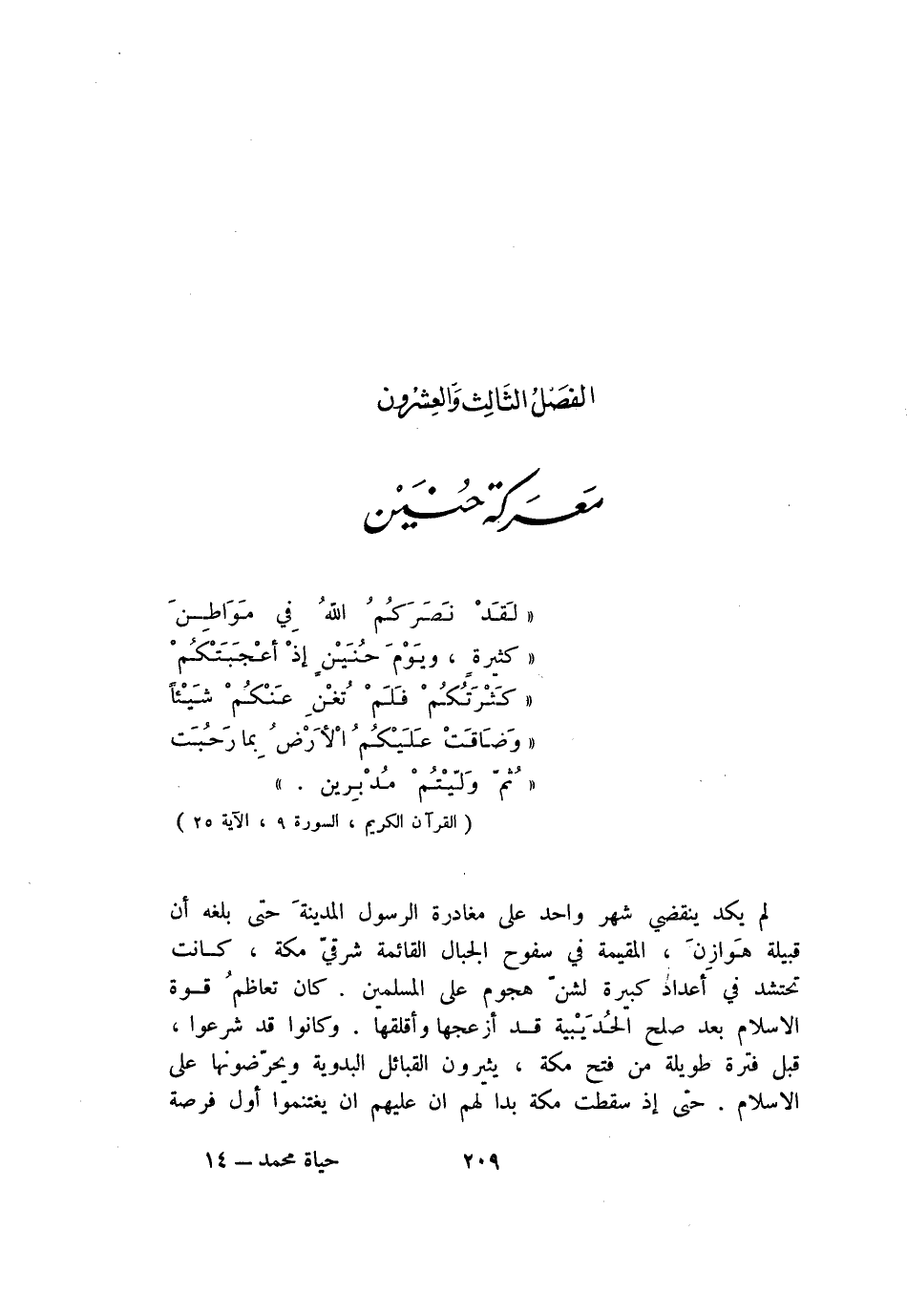 «لَقَدْ نَصَرَكُمُ اللَّهُ فِي مَواطِنَ «كَثِيرَةٍ، وَيَوْمَ حُنَيْنٍ إِذْ أَعْجَبَتْكُمْ «كَثْرَتُكُمْ فَلَمْ تُغْنِ عَنْكُمْ شَيْئاً «وَضاقَتْ عَلَيْكُمُ الْأَرْضُ بِما رَحُبَتْ «ثُمَّ وَلَّيْتُمْ مُدْبِرِينَ.»