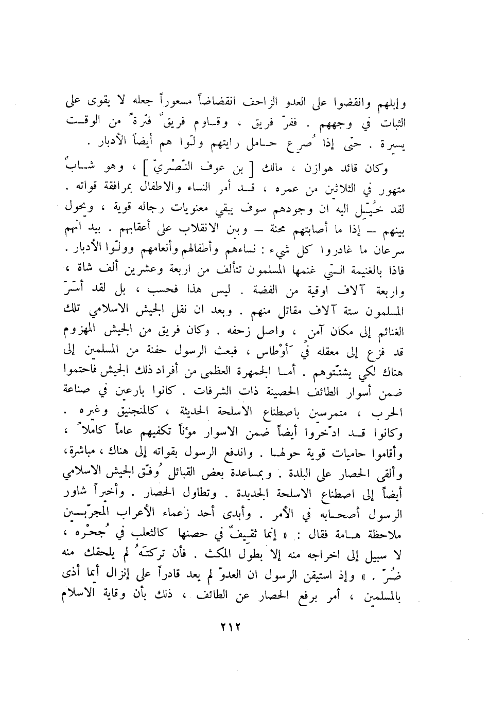 وكانوا قد ادّخروا أيضا ضمن الاسوار مؤنا تكفيهم عاما كاملا، وأقاموا حاميات قوية حولها. واندفع الرسول بقواته إلى هناك، مباشرة، وألقى الحصار على البلدة. وبمساعدة بعض القبائل وفّق الجيش الاسلامي أيضا إلى اصطناع الاسلحة الجديدة. وتطاول الحصار. وأخيرا شاور الرسول أصحابه في الأمر. وأبدى أحد زعماء الأعراب المجرّبين ملاحظة هامة فقال: «إنما ثقيف في حصنها كالثعلب في جحره، لا سبيل إلى اخراجه منه إلا بطول المكث. فأن تركته لم يلحقك منه ضرّ.» وإذ استيقن الرسول ان العدوّ لم يعد قادرا على إنزال أيما أذى بالمسلمين، أمر برفع الحصار عن الطائف، ذلك بأن وقاية الاسلام