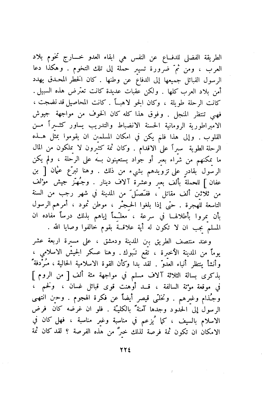وعند منتصف الطريق بين المدينة ودمشق، على مسيرة اربعة عشر يوما من المدينة الأخيرة، تقع تبوك. وهنا عسكر الجيش الاسلامي، وأنشأ ينتظر أنباء العدوّ. لقد بدا وكأن القوة الاسلامية الحالية، مردفة بذكرى بسالة الثلاثة آلاف مسلم في مواجهة مئة ألف [من الروم] في موقعة مؤتة السالفة، قد أوهنت قوى قبائل غسان، ولخم، وجذام وغيرهم. وتخلّى قيصر أيضا عن فكرة الهجوم. وحين انتهى الرسول إلى الحدود وجدها آمنة بالكليّة. فلو ان غرضه كان فرض الاسلام بالسيف، كما يزعم في مناسبة وغير مناسبة، فهل كان في الامكان ان تكون ثمة فرصة لذلك خير من هذه الفرصة؟ لقد كان ثمة