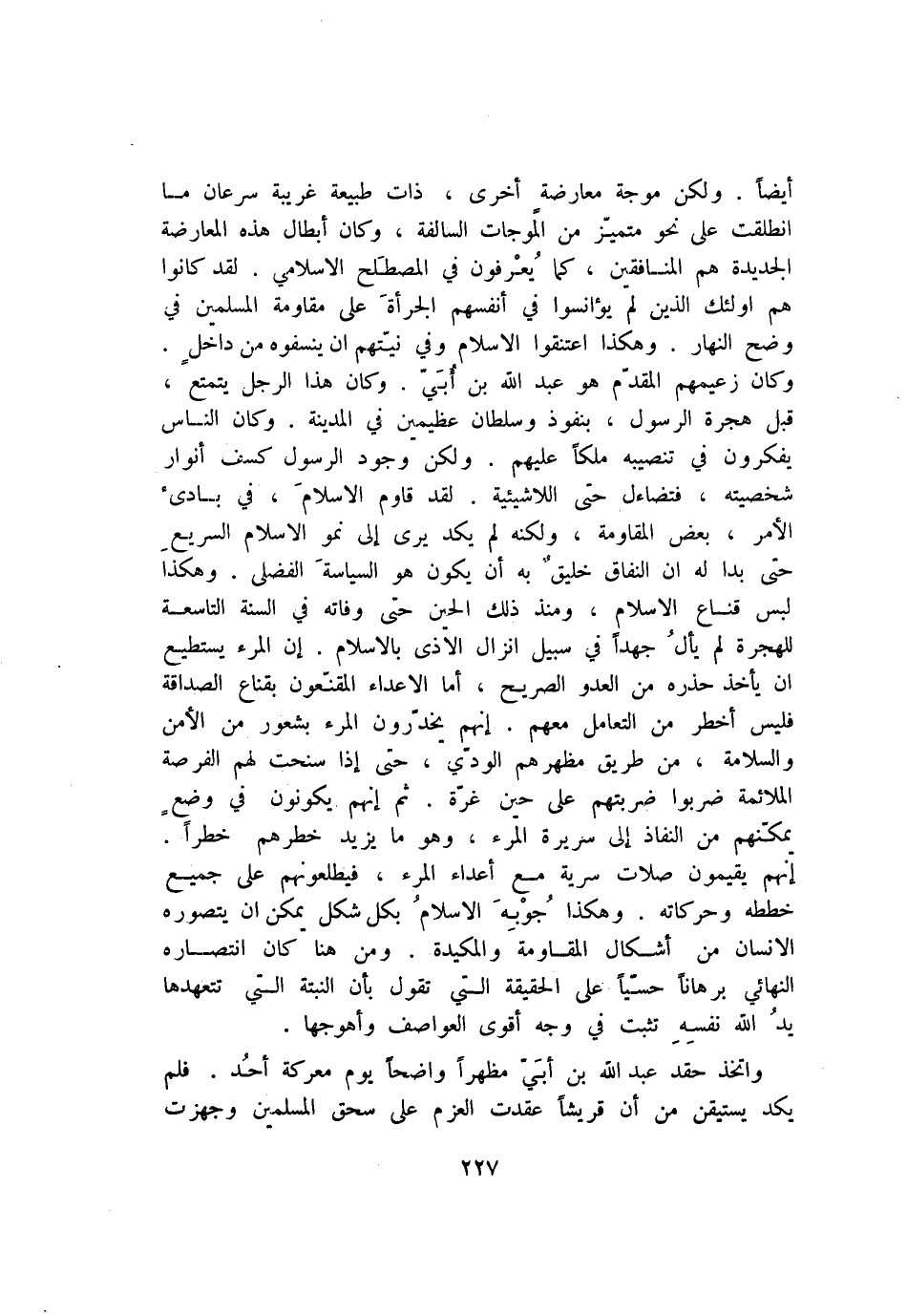 أيضا. ولكن موجة معارضة أخرى، ذات طبيعة غريبة سرعان ما انطلقت على نحو متميّز من الموجات السالفة، وكان أبطال هذه المعارضة الجديدة هم المنافقين، كما يعرفون في المصطلح الاسلامي. لقد كانوا هم اولئك الذين لم يؤانسوا في أنفسهم الجرأة على مقاومة المسلمين في وضح النهار. وهكذا اعتنقوا الاسلام وفي نيّتهم ان ينسفوه من داخل.