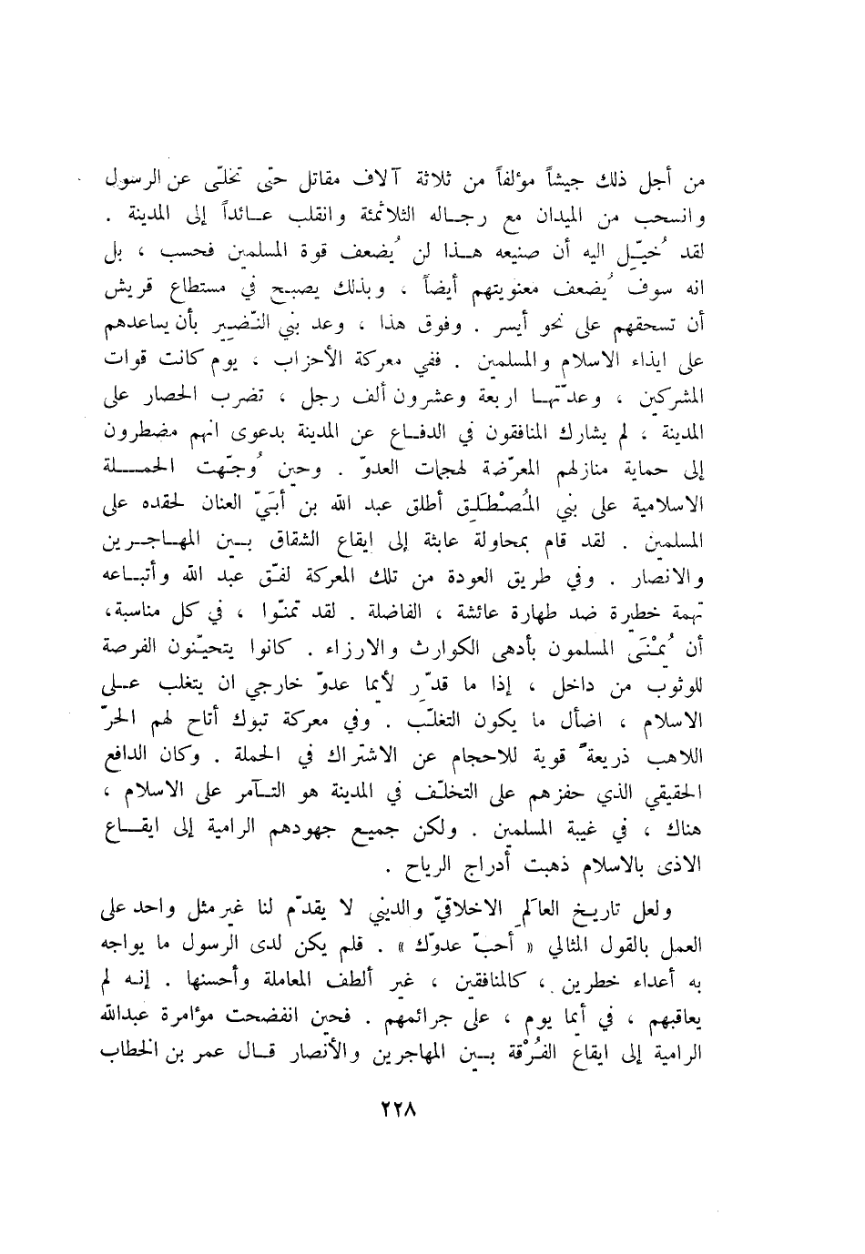 ولعل تاريخ العالم الاخلاقيّ والديني لا يقدّم لنا غير مثل واحد على العمل بالقول المثالي «أحبّ عدوّك» . فلم يكن لدى الرسول ما يواجه به أعداء خطرين، كالمنافقين، غير ألطف المعاملة وأحسنها. إنه لم يعاقبهم، في أيما يوم، على جرائمهم. فحين انفضحت مؤامرة عبد الله الرامية إلى ايقاع الفرقة بين المهاجرين والأنصار قال عمر بن الخطاب