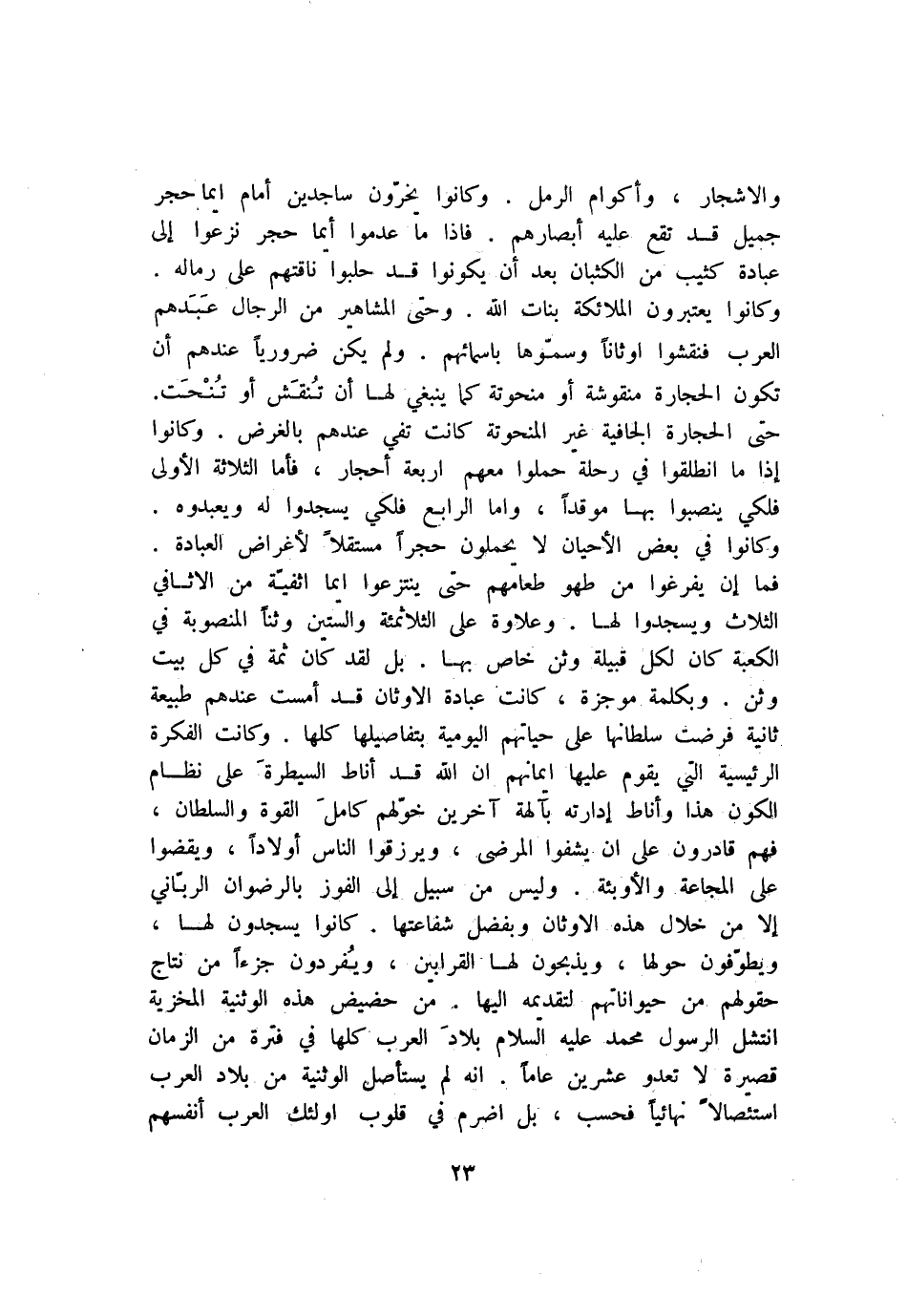 فما إن يفرغوا من طهو طعامهم حتى ينتزعوا ايما اثفيّة من الاثافي الثلاث ويسجدوا لها. وعلاوة على الثلاثمئة والستين وثنا المنصوبة في الكعبة كان لكل قبيلة وثن خاص بها. بل لقد كان ثمة في كل بيت وثن. وبكلمة موجزة، كانت عبادة الاوثان قد أمست عندهم طبيعة ثانية فرضت سلطانها على حياتهم اليومية بتفاصيلها كلها. وكانت الفكرة الرئيسية التي يقوم عليها ايمانهم ان الله قد أناط السيطرة على نظام الكون هذا وأناط إدارته بآلهة آخرين خوّلهم كامل القوة والسلطان، فهم قادرون على أن يشفوا المرضى، ويرزقوا الناس أولادا، ويقضوا على المجاعة والأوبئة. وليس من سبيل إلى الفوز بالرضوان الربّاني إلا من خلال هذه الاوثان وبفضل شفاعتها. كانوا يسجدون لها، ويطوّفون حولها، ويذبحون لها القرابين، ويفردون جزآ من نتاج حقولهم من حيواناتهم لتقديمه اليها. من حضيض هذه الوثنية المخزية انتشل الرسول محمد عليه السلام بلاد العرب كلها في فترة من الزمان قصيرة لا تعدو عشرين عاما. انه لم يستأصل الوثنية من بلاد العرب استئصالا نهائيا فحسب، بل اضرم في قلوب اولئك العرب أنفسهم