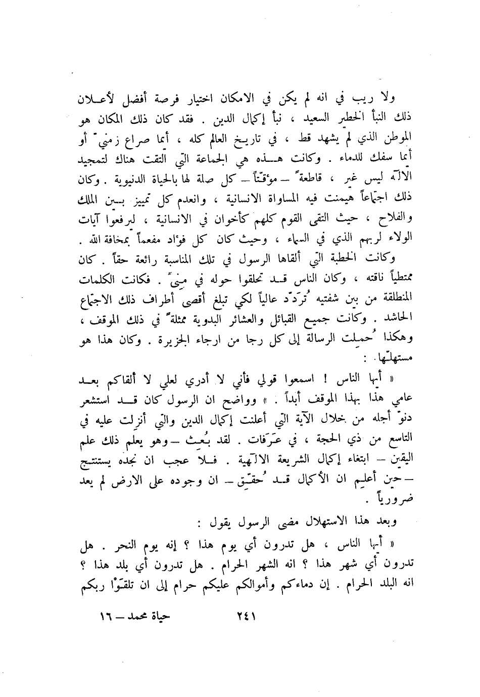 ولا ريب في انه لم يكن في الامكان اختيار فرصة أفضل لأعلان ذلك النبأ الخطير السعيد، نبأ إكمال الدين. فقد كان ذلك المكان هو الموطن الذي لم يشهد قط، في تاريخ العالم كله، أيما صراع زمنيّ أو أيما سفك للدماء. وكانت هذه هي الجماعة التي التقت هناك لتمجيد الاله ليس غير، قاطعة- مؤقّتا- كل صلة لها بالحياة الدنيوية. وكان ذلك اجتماعا هيمنت فيه المساواة الانسانية، وانعدم كل تمييز بين الملك والفلاح، حيث التقى القوم كلهم كأخوان في الانسانية، ليرفعوا آيات الولاء لربهم الذي في السماء، وحيث كان كل فؤاد مفعما بمخافة الله.