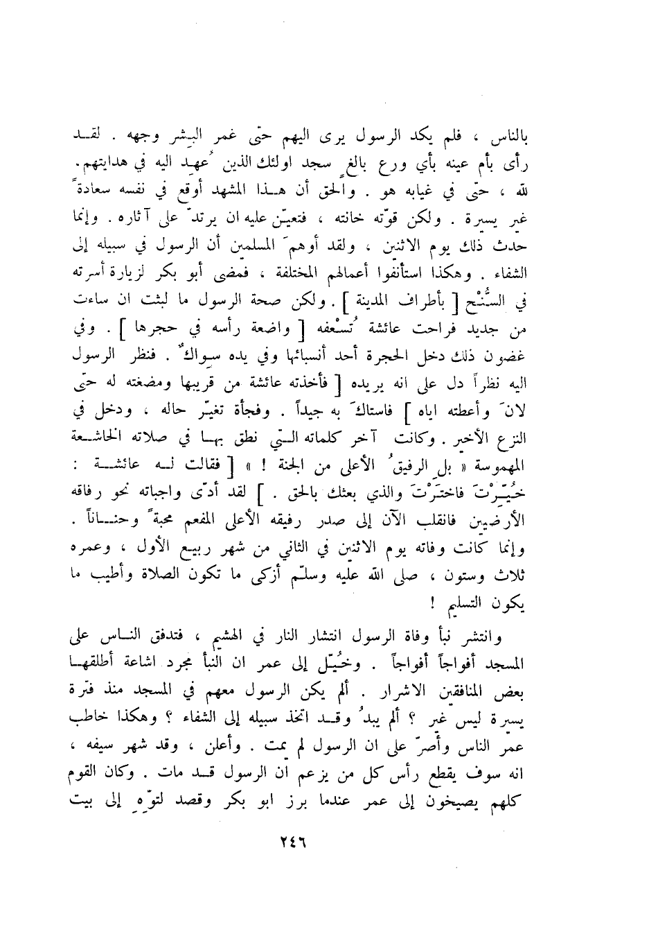 لله، حتى في غيابه هو. والحق أن هذا المشهد أوقع في نفسه سعادة غير يسيرة. ولكن قوّته خانته، فتعيّن عليه ان يرتدّ على آثاره. وإنما حدث ذلك يوم الاثنين، ولقد أوهم المسلمين. أن الرسول في سبيله إلى الشفاء. وهكذا استأنفوا أعمالهم المختلفة، فمضى أبو بكر لزيارة أسرته في السّنح [بأطراف المدينة] . ولكن صحة الرسول ما لبثت ان ساءت من جديد فراحت عائشة تسعفه [واضعة رأسه في حجرها] . وفي غضون ذلك دخل الحجرة أحد أنسبائها وفي يده سواك. فنظر الرسول اليه نظرا دل على انه يريده [فأخذته عائشة من قريبها ومضغته له حتى لان وأعطته اياه] فاستاك به جيدا. وفجأة تغيّر حاله، ودخل في النزع الأخير. وكانت آخر كلماته التي نطق بها في صلاته الخاشعة المهموسة «بل الرفيق الأعلى من الجنة!» [فقالت له عائشة: