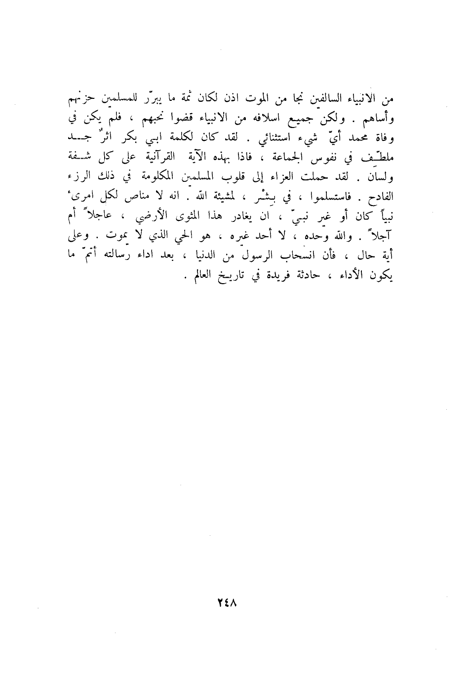 من الانبياء السالفين نجا من الموت اذن لكان ثمة ما يبرّر للمسلمين حزنهم وأساهم. ولكن جميع اسلافه من الانبياء قضوا نحبهم، فلم يكن في وفاة محمد أيّ شيء استثنائي. لقد كان لكلمة ابي بكر اثر جد ملطّف في نفوس الجماعة، فاذا بهذه الآية القرآنية على كل شفة ولسان. لقد حملت العزاء إلى قلوب المسلمين المكلومة في ذلك الرزء الفادح. فاستسلموا، في بشر، لمشيئة الله. انه لا مناص لكل امرئ نبيا كان أو غير نبيّ، ان يغادر هذا المثوى الأرضي، عاجلا أم آجلا. والله وحده، لا أحد غيره، هو الحي الذي لا يموت. وعلى أية حال، فأن انسحاب الرسول من الدنيا، بعد اداء رسالته أتمّ ما يكون الأداء، حادثة فريدة في تاريخ العالم.