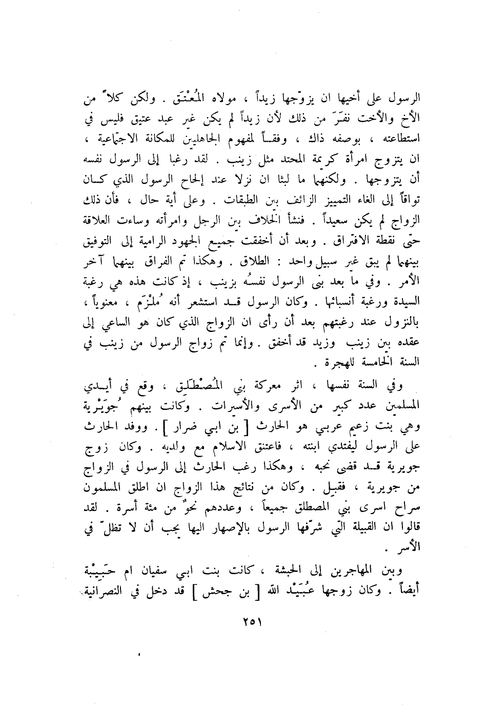 الرسول على أخيها ان يزوّجها زيدا، مولاه المعتق. ولكن كلا من الأخ والأخت نفر من ذلك لأن زيدا لم يكن غير عبد عتيق فليس في استطاعته، بوصفه ذاك، وفقا لمفهوم الجاهليين للمكانة الاجتماعية، ان يتزوج امرأة كريمة المحتد مثل زينب. لقد رغبا إلى الرسول نفسه أن يتزوجها. ولكنّهما ما لبثا ان نزلا عند إلحاح الرسول الذي كان تواقا إلى الغاء التمييز الزائف بين الطبقات. وعلى أية حال، فأن ذلك الزواج لم يكن سعيدا. فنشأ الخلاف بين الرجل وامرأته وساءت العلاقة حتى نقطة الافتراق. وبعد أن أخفقت جميع الجهود الرامية إلى التوفيق بينهما لم يبق غير سبيل واحد: الطلاق. وهكذا تم الفراق بينهما آخر الأمر. وفي ما بعد بنى الرسول نفسه بزينب، إذ كانت هذه هي رغبة السيدة ورغبة أنسبائها. وكان الرسول قد استشعر أنه ملزم، معنويا، بالنزول عند رغبتهم بعد أن رأى ان الزواج الذي كان هو الساعي إلى عقده بين زينب وزيد قد أخفق. وإنما تم زواج الرسول من زينب في السنة الخامسة للهجرة.