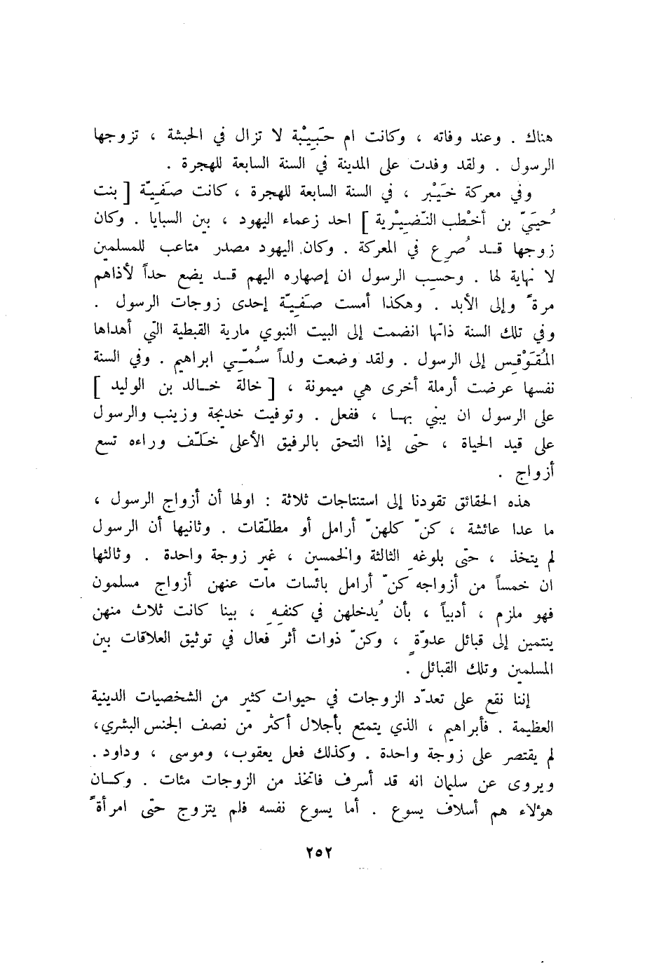 هذه الحقائق تقودنا إلى استنتاجات ثلاثة: أولها أن أزواج الرسول، ما عدا عائشة، كنّ كلهنّ أرامل أو مطلّقات. وثانيها أن الرسول لم يتخذ، حتى بلوغه الثالثة والخمسين، غير زوجة واحدة. وثالثها ان خمسا من أزواجه كنّ أرامل بائسات مات عنهن أزواج مسلمون فهو ملزم، أدبيا، بأن يدخلهن في كنفه، بينا كانت ثلاث منهن ينتمين إلى قبائل عدوّة، وكنّ ذوات أثر فعال في توثيق العلاقات بين المسلمين وتلك القبائل.
