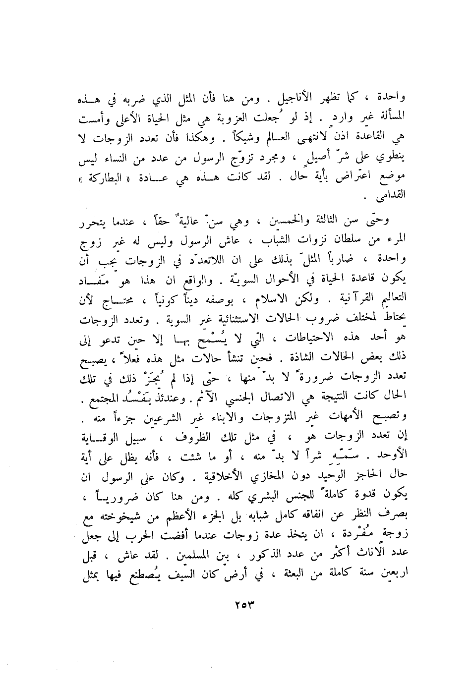 إن تعدد الزوجات هو، في مثل تلك الظروف، سبيل الوقاية الأوحد. سمّه شرا لا بدّ منه، أو ما شئت، فأنه يظل على أية حال الحاجز الوحيد دون المخازي الأخلاقية. وكان على الرسول ان يكون قدوة كاملة للجنس البشري كله. ومن هنا كان ضروريا، بصرف النظر عن انفاقه كامل شبابه بل الجزء الأعظم من شيخوخته مع زوجة مفردة، ان يتخذ عدة زوجات عندما أفضت الحرب إلى جعل عدد الاناث أكثر من عدد الذكور، بين المسلمين. لقد عاش، قبل اربعين سنة كاملة من البعثة، في أرض كان السيف يصطنع فيها بمثل