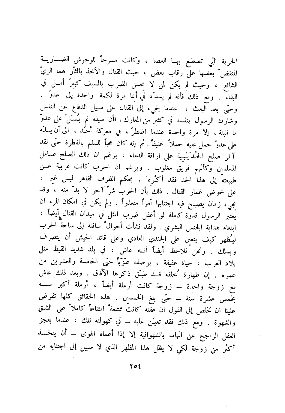 وحتى بعد البعث، عندما لجيء إلى القتال على سبيل الدفاع عن النفس وشارك الرسول بنفسه في كثير من المعارك، فأن سيفه لم يسلّ على عدوّ ما البتة، إلا مرة واحدة عندما اضطرّ، في معركة أحد، إلى أن يسلّه على عدوّ حمل عليه حملا عنيفا. ثم إنه كان محبا للسلم بالفطرة حتى لقد آثر صلح الحديبية على اراقة الدماء، برغم ان ذلك الصلح عامل المسلمين وكأنهم فريق مغلوب. وبرغم ان الحرب كانت غريبة عن طبيعته إلى هذا الحد فقد أكره، بحكم الظرف القاهر ليس غير، على خوض غمار القتال. ذلك بأن الحرب شر آخر لا بدّ منه، وقد يجيء زمان يصبح فيه اجتنابها أمرا متعذرا. ولم يكن في امكان المرء ان يعتبر الرسول قدوة كاملة لو أغفل ضرب المثل في ميدان القتال أيضا، ابتغاء هداية الجنس البشري. ولقد نشأت أحوال ساقته إلى ساحة الحرب ليظهر كيف يتعين على الجندي العادي وعلى قائد الجيش أن يتصرف ويسلك. ونحن نلاحظ أيضا أنه عاش، في بلد شديد القيظ مثل بلاد العرب، حياة عفيفة، بوصفه عزبا حتى الخامسة والعشرين من عمره. إن طهارة خلقه قد طبّق ذكرها الآفاق. وبعد ذلك عاش مع زوجة واحدة- زوجة كانت أرملة أيضا، أرملة أكبر منه بخمس عشرة سنة- حتى بلغ الخمسين. هذه الحقائق كلها تفرض علينا ان نخلص إلى القول ان عفته كانت ممتنعة امتناعا كاملا على الشق والشهوة. ومع ذلك فقد تعيّن عليه- في كهولته تلك، عندما يعجز العقل الراجح عن اتهامه بالشهوانية إلا إذا أعماه الهوى- أن يتخذ أكثر من زوجة لكي لا يظل هذا المظهر الذي لا سبيل إلى اجتنابه من