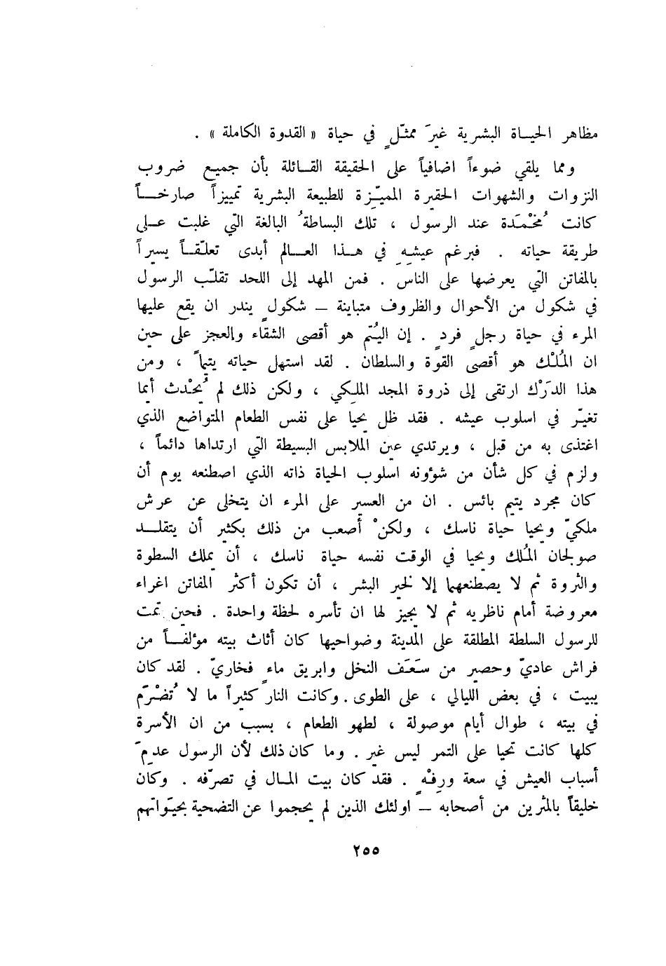 ومما يلقي ضوآ اضافيا على الحقيقة القائلة بأن جميع ضروب النزوات والشهوات الحقيرة المميّزة للطبيعة البشرية تمييزا صارخا كانت محمدة عند الرسول، تلك البساطة البالغة التي غلبت على طريقة حياته. فبرغم عيشه في هذا العالم أبدى تعلّقا يسيرا بالمفاتن التي يعرضها على الناس. فمن المهد إلى اللحد تقلّب الرسول في شكول من الأحوال والظروف متباينة- شكول يندر ان يقع عليها المرء في حياة رجل فرد. إن اليتم هو أقصى الشقاء والعجز على حين ان الملك هو أقصى القوة والسلطان. لقد استهل حياته يتيما، ومن هذا الدرك ارتقى إلى ذروة المجد الملكي، ولكن ذلك لم يحدث أيما تغيّر في اسلوب عيشه. فقد ظل يحيا على نفس الطعام المتواضع الذي اغتذى به من قبل، ويرتدي عين الملابس البسيطة التي ارتدادها دائما، ولزم في كل شأن من شؤونه اسلوب الحياة ذاته الذي اصطنعه يوم أن كان مجرد يتيم بائس. ان من العسير على المرء ان يتخلى عن عرش ملكيّ ويحيا حياة ناسك، ولكن أصعب من ذلك بكثير أن يتقلد صولجان الملك ويحيا في الوقت نفسه حياة ناسك، أن يملك السطوة والثروة ثم لا يصطنعهما إلا لخير البشر، أن تكون أكثر المفاتن اغراء معروضة أمام ناظريه ثم لا يجيز لها ان تأسره لحظة واحدة. فحين تمت للرسول السلطة المطلقة على المدينة وضواحيها كان أثاث بيته مؤلفا من فراش عاديّ وحصير من سعف النخل وابريق ماء فخاريّ. لقد كان يبيت، في بعض الليالي، على الطوى. وكانت النار كثيرا ما لا تضرم في بيته، طوال أيام موصولة، لطهو الطعام، بسبب من ان الأسرة كلها كانت تحيا على التمر ليس غير. وما كان ذلك لأن الرسول عدم أسباب العيش في سعة ورفه. فقد كان بيت المال في تصرّفه. وكان خليقا بالمثرين من أصحابه- اولئك الذين لم يحجموا عن التضحية بحيواتهم