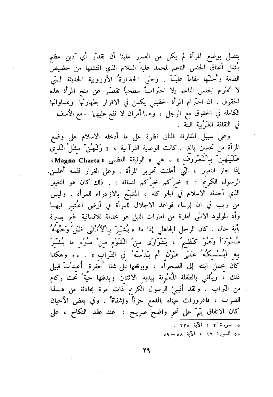 وعلى سبيل المقارنة فلنلق نظرة على ما أدخله الاسلام على وضع المرأة من تحسين بالغ. كانت الوصية القرآنية، «وَلَهُنَّ مِثْلُ الَّذِي عَلَيْهِنَّ بِالْمَعْرُوفِ» * هي «الوثيقة العظمى Magna Charta «إذا جاز التعبير، التي أعلنت تحرير المرأة. وعلى الغرار نفسه أعلن الرسول الكريم: «خيركم خيركم لنسائه» . ذلك كان هو التغيير الذي أحدثه الاسلام في الجو كله، المشبع بالازدراء للمرأة. وليس من ريب في ان إرساء قواعد الاجلال للمرأة في أرض اعتبر فيها وأد المولود الانثى أمارة من امارات النبل هو خدمة للانسانية غير يسيرة بأية حال. كان الرجل الجاهلي إذا ما «بُشِّرَ أَحَدُهُمْ بِالْأُنْثى ظَلَّ وَجْهُهُ مُسْوَدًّا وَهُوَ كَظِيمٌ، يَتَوارى مِنَ الْقَوْمِ مِنْ سُوءِ ما بُشِّرَ بِهِ أَيُمْسِكُهُ عَلى هُونٍ أَمْ يَدُسُّهُ فِي التُّرابِ» . ** وهكذا كان يحمل ابنته إلى الصحراء، ويوقفها على شفا حفرة أعدّت قبيل ذلك، ويلقي بالطفلة المعولة بيديه الاثنين ويدفنها حية تحت ركام من التراب. ولقد أنبئ الرسول الكريم ذات مرة بحادثة من هذا الضرب، فاغرورقت عيناه بالدمع حزنا وإشفاقا. وفي بعض الأحيان كان الاتفاق يتمّ على نحو واضح صريح، عند عقد النكاح، على