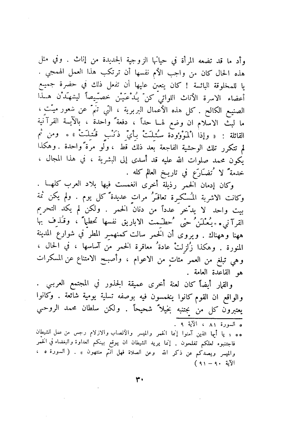 يا للمخلوقة البائسة! كان يتعين عليها أن تفعل ذلك في حضرة جميع أعضاء الاسرة الأناث اللواتي كنّ يدعين خصّيصا ليشهدن هذا الصنيع الكالح. كل هذه الأعمال البربرية، التي تنمّ عن شعور ميّت، ما لبث الاسلام ان وضع لها حدا، دفعة واحدة، بالآية القرآنية القائلة: «وَإِذَا الْمَوْؤُدَةُ سُئِلَتْ بِأَيِّ ذَنْبٍ قُتِلَتْ» * ومن ثم لم تتكرر تلك الوحشية الفاجعة بعد ذلك قط، ولو مرة واحدة. وهكذا يكون محمد صلوات الله عليه قد أسدى إلى البشرية، في هذا المجال، خدمة لا تضارع في تاريخ العالم كله.