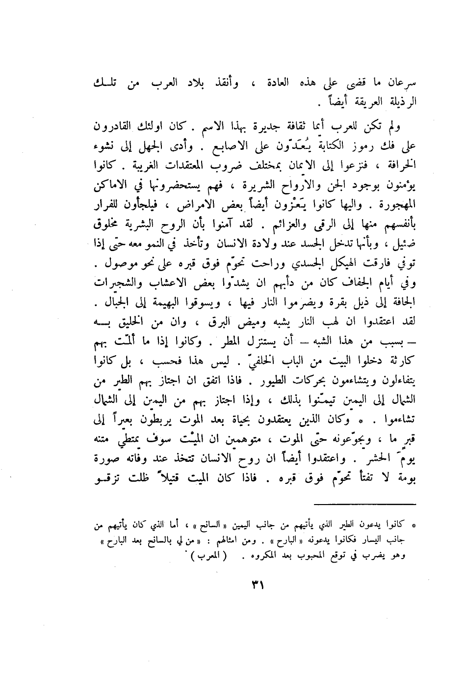 لقد اعتقدوا ان لهب النار يشبه وميض البرق، وان من الخليق به- بسبب من هذا الشبه- أن يستنزل المطر. وكانوا إذا ما ألّمت بهم كارثة دخلوا البيت من الباب الخلفيّ. ليس هذا فحسب، بل كانوا يتفاءلون ويتشاءمون بحركات الطيور. فاذا اتفق ان اجتاز بهم الطير من الشمال إلى اليمين تيمّنوا بذلك، وإذا اجتاز بهم من اليمين إلى الشمال تشاءموا. * وكان الذين يعتقدون بحياة بعد الموت يربطون بعيرا إلى قبر ما، ويجوّعونه حتى الموت، متوهمين ان الميت سوف يمتطي متنه يوم الحشر. واعتقدوا أيضا ان روح الانسان تتخذ عند وفاته صورة بومة لا تفتأ تحوّم فوق قبره. فاذا كان الميت قتيلا ظلت تزقو