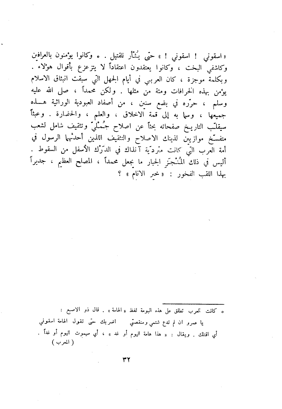وبكلمة موجزة، كان العربي في أيام الجهل التي سبقت انبثاق الاسلام يؤمن بهذه الخرافات ومئة من مثلها. ولكن محمدا، صلى الله عليه وسلم، حرّره في بضع سنين، من أصفاد العبودية الوراثية هذه جميعها، وسما به إلى قمة الاخلاق، والعلم، والحضارة. وعبثا سيقلّب التاريخ صفحاته بحثا عن اصلاح جمليّ وتثقيف شامل لشعب متفسّخ موازيين لذينك الاصلاح والتثنيف اللذين أحدثهما الرسول في أمة العرب التي كانت متردّية آنذاك في الدرك الأسفل من السقوط.