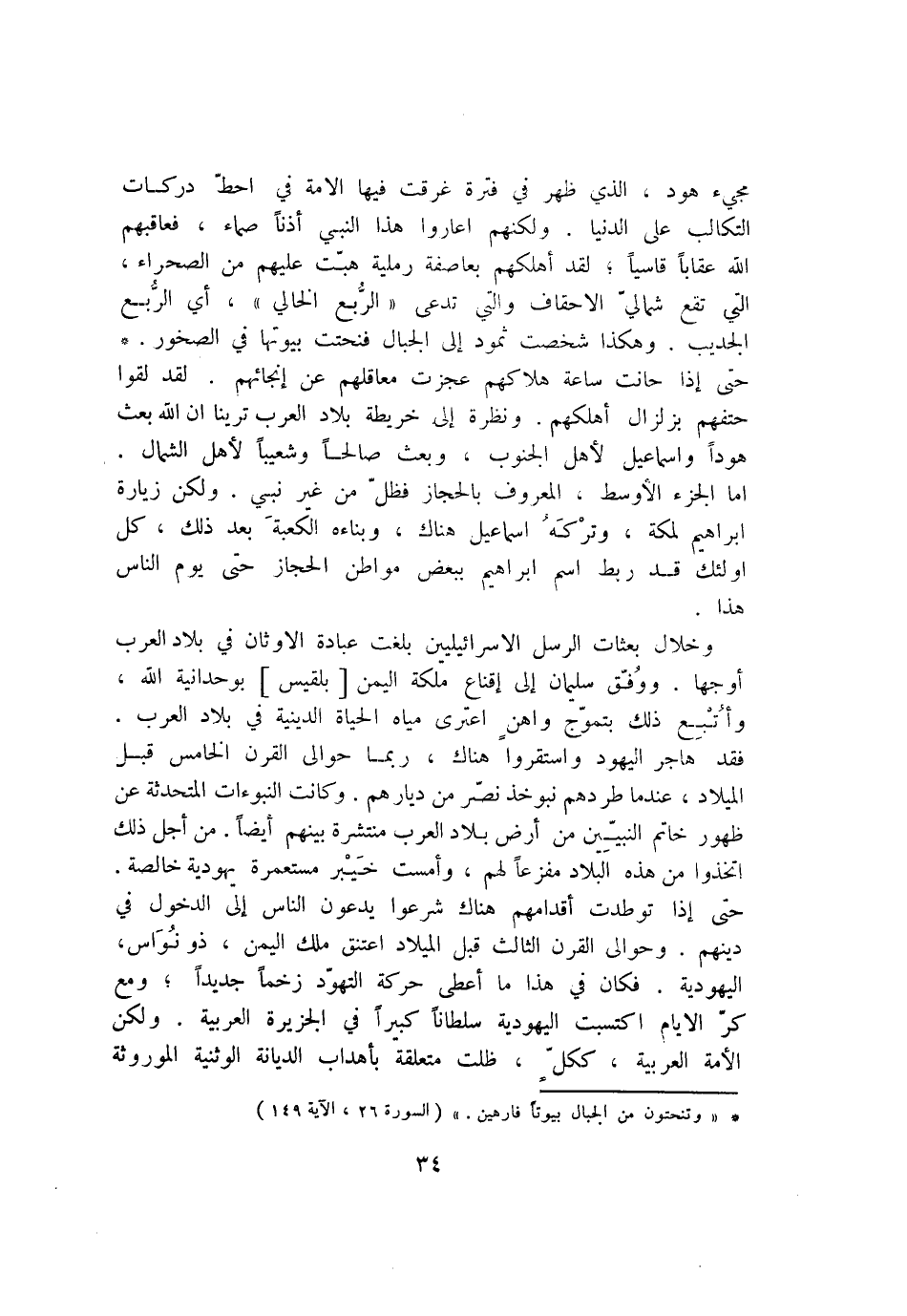 مجيء هود، الذي ظهر في فترة غرقت فيها الامة في احطّ دركات التكالب على الدنيا. ولكنهم اعاروا هذا النبي أذنا صماء، فعاقبهم الله عقابا قاسيا؛ لقد أهلكهم بعاصفة رملية هبّت عليهم من الصحراء، التي تقع شماليّ الاحقاف والتي تدعى «الرّبع الخالي» ، أي الرّبع الجديب. وهكذا شخصت ثمود إلى الجبال فنحتت بيوتها في الصخور. *