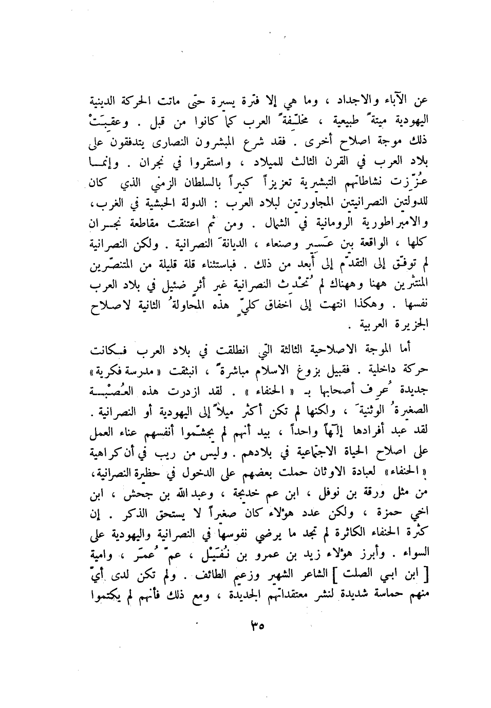 أما الموجة الاصلاحية الثالثة التي انطلقت في بلاد العرب فكانت حركة داخلية. فقبيل بزوغ الاسلام مباشرة، انبثقت «مدرسة فكرية» جديدة عرف أصحابها ب «الحنفاء» . لقد ازدرت هذه العصبة الصغيرة الوثنية، ولكنها لم تكن أكثر ميلا إلى اليهودية أو النصرانية.