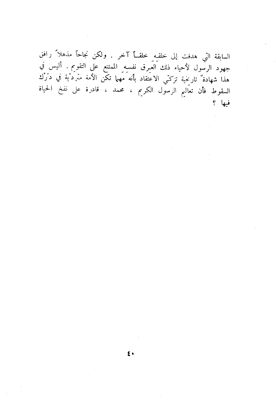 السابقة التي هدفت إلى خلقه خلقا آخر. ولكن نجاحا مذهلا رافق جهود الرسول لأحياء ذلك العرق نفسه الممتنع على التقويم. أليس في هذا شهادة تاريخية تزكّي الاعتقاد بأنه مهما تكن الأمة متردّية في درك السقوط فأن تعاليم الرسول الكريم، محمد، قادرة على نفخ الحياة فيها؟