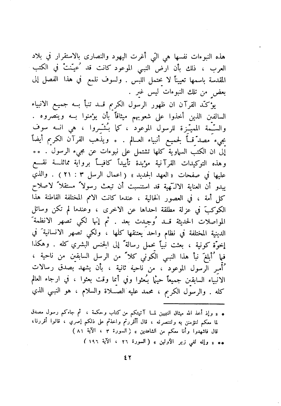 وهذه التوكيدات القرآنية مؤيدة تأييدا كافيا برواية مماثلة نقع عليها في صفحات «العهد الجديد» (اعمال الرسل 3: 21) . والذي يبدو أن العناية الالهية قد استنسبت أن تبعث رسولا مستقلا لاصلاح كل أمة، في العصور الخالية، عندما كانت الامم المختلفة القاطنة هذا الكوكب في عزلة مطلقة احداها عن الاخرى، وعندما لم تكن وسائل المواصلات الحديثة قد وجدت بعد. ثم إنها لكي تصهر الانظمة الدينية المختلفة في نظام واحد يعتنقها كلها، ولكي تصهر الانسانية في إخوّة كونية، بعثت نبيا يحمل رسالة إلى الجنس البشري كله. وهكذا فيما أبلغ نبأ هذا النبي الكوني كلا من الرسل السابقين من ناحية، أمر الرسول الموعود، من ناحية ثانية، بأن يشهد بصدق رسالات الانبياء السابقين جميعا حيثما بعثوا وفي أيما وقت بعثوا، في ارجاء العالم كله. والرسول الكريم، محمد عليه الصلاة والسلام، هو النبي الذي