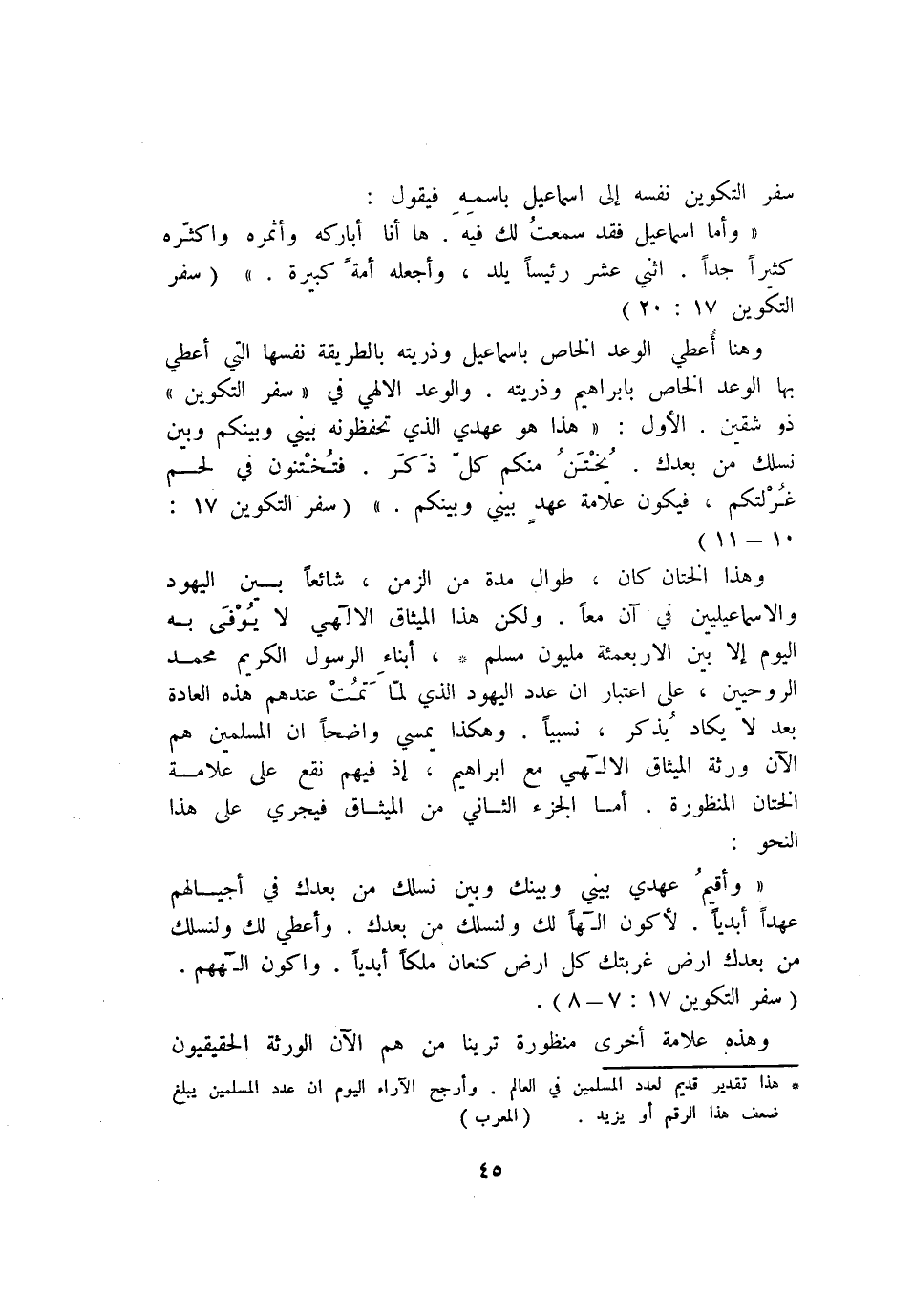 وهذا الختان كان، طوال مدة من الزمن، شائعا بين اليهود والاسماعيليين في آن معا. ولكن هذا الميثاق الالهي لا يوفى به اليوم إلا بين الاربعمئة مليون مسلم*، أبناء الرسول الكريم محمد الروحيين، على اعتبار ان عدد اليهود الذي لمّا تمت عندهم هذه العادة بعد لا يكاد يذكر، نسيبا. وهكذا يمسي واضحا ان المسلمين هم الآن ورثة الميثاق الالهي مع ابراهيم، إذ فيهم نقع على علامة الختان المنظورة. أما الجزء الثاني من الميثاق فيجري على هذا النحو: