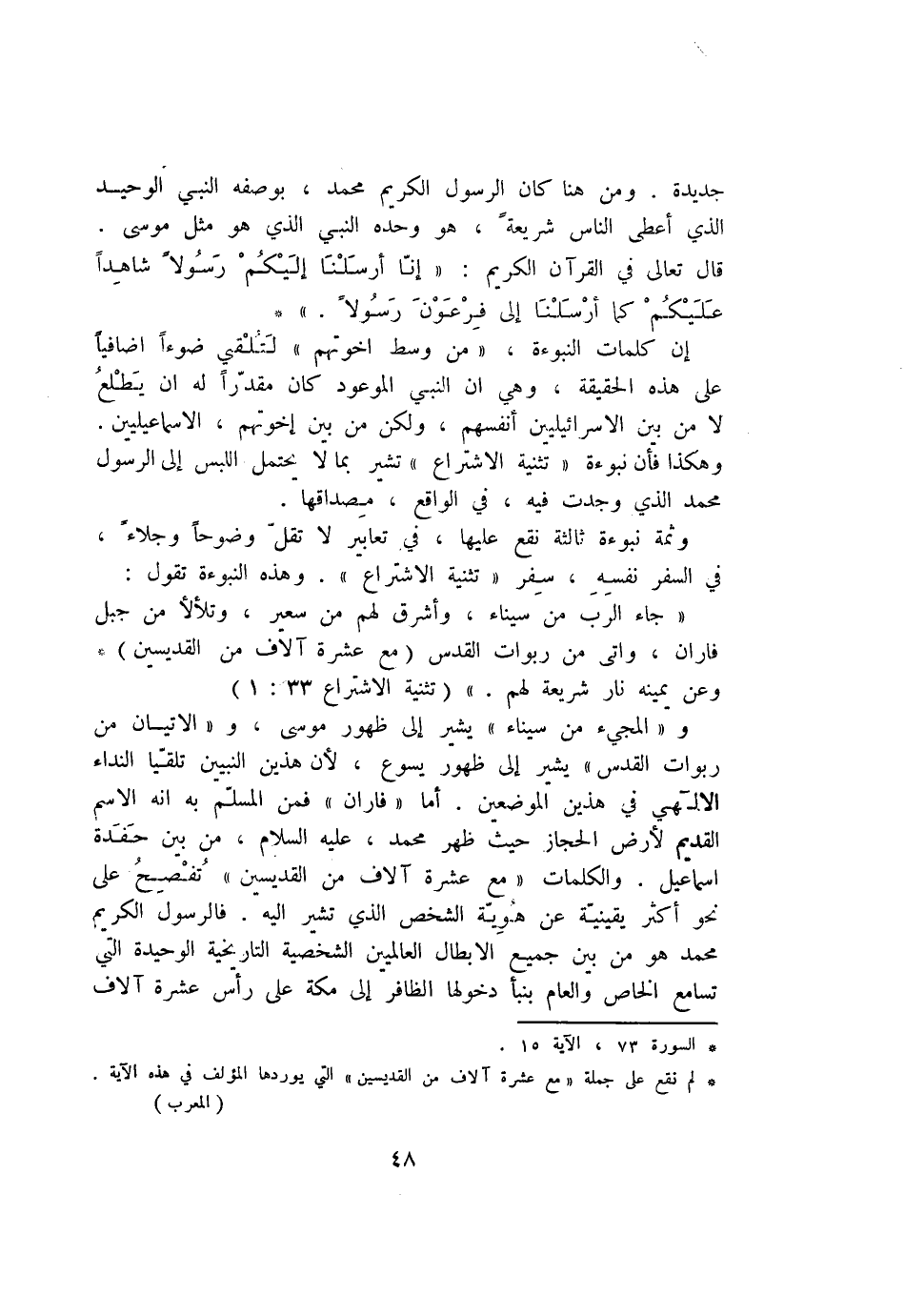 جديدة. ومن هنا كان الرسول الكريم محمد، بوصفه النبي الوحيد الذي أعطى الناس شريعة، هو وحده النبي الذي هو مثل موسى.