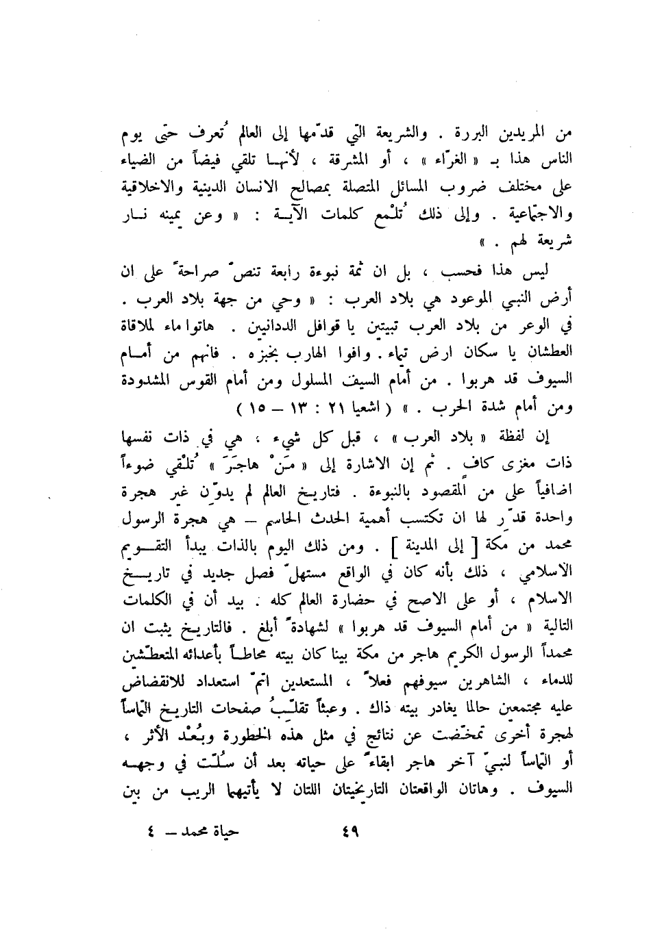 إن لفظة «بلاد العرب» ، قبل كل شيء، هي في ذات نفسها ذات مغزى كاف. ثم إن الاشارة إلى «من هاجر» تلقي ضوآ اضافيا على من المقصود بالنبوءة. فتاريخ العالم لم يدوّن غير هجرة واحدة قدّر لها ان تكتسب أهمية الحدث الحاسم- هي هجرة الرسول محمد من مكة [إلى المدينة] . ومن ذلك اليوم بالذات يبدأ التقويم الاسلامي، ذلك بأنه كان في الواقع مستهلّ فصل جديد في تاريخ الاسلام، أو على الاصح في حضارة العالم كله. بيد أن في الكلمات التالية «من أمام السيوف قد هربوا» لشهادة أبلغ. فالتاريخ يثبت أن محمدا الرسول الكريم هاجر من مكة بينا كان بيته محاطا بأعدائه المتعطّشين للدماء، الشاهرين سيوفهم فعلا، المستعدين اتمّ استعداد للانقضاض عليه مجتميعن حالما يغادر بيته ذاك. وعبثا تقلّب صفحات التاريخ التماسا لهجرة أخرى تمخّضت عن نتائج في مثل هذه الخطورة وبعد الأثر، أو التماسا لنبي آخر هاجر ابقاء على حياته بعد أن سلّت في وجهه السيوف. وهاتان الواقعتان التاريخيتان اللتان لا يأتيهما الريب من بين