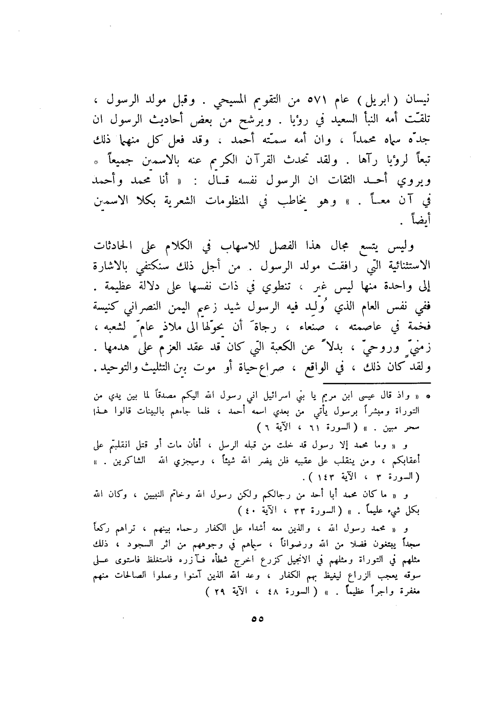 (*) «وَإِذْ قالَ عِيسَى ابْنُ مَرْيَمَ يا بَنِي إِسْرائِيلَ إِنِّي رَسُولُ اللَّهِ إِلَيْكُمْ مُصَدِّقاً لِما بَيْنَ يَدَيَّ مِنَ التَّوْراةِ وَمُبَشِّراً بِرَسُولٍ يَأْتِي مِنْ بَعْدِي اسْمُهُ أَحْمَدُ، فَلَمَّا جاءَهُمْ بِالْبَيِّناتِ قالُوا هذا سِحْرٌ مُبِينٌ.» (السورة 61، الآية 6) و «وَما مُحَمَّدٌ إِلَّا رَسُولٌ قَدْ خَلَتْ مِنْ قَبْلِهِ الرُّسُلُ، أَفَإِنْ ماتَ أَوْ قُتِلَ انْقَلَبْتُمْ عَلى أَعْقابِكُمْ، وَمَنْ يَنْقَلِبْ عَلى عَقِبَيْهِ فَلَنْ يَضُرَّ اللَّهَ شَيْئاً، وَسَيَجْزِي اللَّهُ الشَّاكِرِينَ.» (السورة 3، الآية 143) . و «ما كانَ مُحَمَّدٌ أَبا أَحَدٍ مِنْ رِجالِكُمْ وَلكِنْ رَسُولَ اللَّهِ وَخاتَمَ النَّبِيِّينَ، وَكانَ اللَّهُ بِكُلِّ شَيْءٍ عَلِيماً.» (السورة 33، الآية 40) . و «مُحَمَّدٌ رَسُولُ اللَّهِ، وَالَّذِينَ مَعَهُ أَشِدَّاءُ عَلَى الْكُفَّارِ رُحَماءُ بَيْنَهُمْ، تَراهُمْ رُكَّعاً سُجَّداً يَبْتَغُونَ فَضْلًا مِنَ اللَّهِ وَرِضْواناً، سِيماهُمْ فِي وُجُوهِهِمْ مِنْ أَثَرِ السُّجُودِ، ذلِكَ مَثَلُهُمْ فِي التَّوْراةِ وَمَثَلُهُمْ فِي الْإِنْجِيلِ كَزَرْعٍ أَخْرَجَ شَطْأَهُ فَآزَرَهُ فَاسْتَغْلَظَ فَاسْتَوى عَلى سُوقِهِ يُعْجِبُ الزُّرَّاعَ لِيَغِيظَ بِهِمُ الْكُفَّارَ، وَعَدَ اللَّهُ الَّذِينَ آمَنُوا وَعَمِلُوا الصَّالِحاتِ مِنْهُمْ مَغْفِرَةً وَأَجْراً عَظِيماً.» (السورة 48، الآية 29)