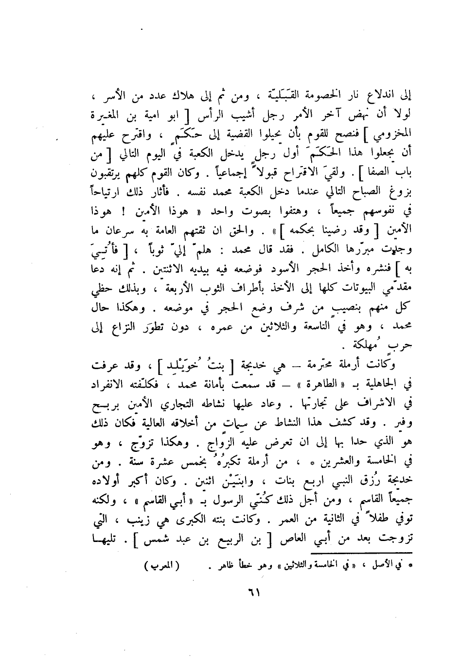 إلى اندلاع نار الخصومة القبليّة، ومن ثم إلى هلاك عدد من الأسر، لولا أن نهض آخر الأمر رجل أشيب الرأس [ابو امية بن المغيرة المخزومي] فنصح للقوم بأن يحيلوا القضية إلى حكم، واقترح عليهم أن يجعلوا هذا الحكم أول رجل يدخل الكعبة في اليوم التالي [من باب الصفا] . ولقي الاقتراح قبولا إجماعيا. وكان القوم كلهم يرتقبون بزوغ الصباح التالي عندما دخل الكعبة محمد نفسه. فأثار ذلك ارتياحا في نفوسهم جميعا، وهتفوا بصوت واحد «هوذا الأمين! هوذا الأمين [وقد رضينا بحكمه] » . والحق ان ثقتهم العامة به سرعان ما وجدت مبرّرها الكامل. فقد قال محمد: هلمّ إليّ ثوبا، [فأتي به] فنشره وأخذ الحجر الأسود فوضعه فيه بيديه الاثنتين. ثم إنه دعا مقدّمي البيوتات كلها إلى الأخذ بأطراف الثوب الأربعة، وبذلك حظي كل منهم بنصيب من شرف وضع الحجر في موضعه. وهكذا حال محمد، وهو في التاسعة والثلاثين من عمره، دون تطور النزاع إلى حرب مهلكة.