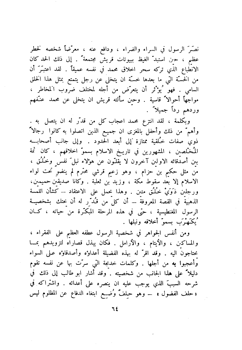 وأهمّ من ذلك وأحفل بالمغزى ان جميع الذين اتصلوا به كانوا رجالا ذوي صفات خلقية ممتازة إلى أبعد الحدود. وإلى جانب أصحابه المخلصين، المشهورين في تاريخ الاسلام بسموّ اخلاقهم، كان ثمة بين أصدقائه الاولين آخرون لا يقلّون عن هؤلاء نبل نفس وخلق، من مثل حكيم بن حزام، وهو زعيم قرشي محترم لم ينضو تحت لواء الاسلام إلا بعد سقوط مكة، وزيد بن ثعلبة. وكانا صديقين حميمين، ورجلين ذوي خلق متين. وهذا يحمل على الاعتقاد- كشأن اللمسة الذهبية في القصة المعروفة- أن كلّ من قدّر له أن يحتك بشخصية الرسول المغنطيسية، حتى في هذه المرحلة المبكّرة من حياته، كان يكهرب بسموّ أخلاقه ونبلها.