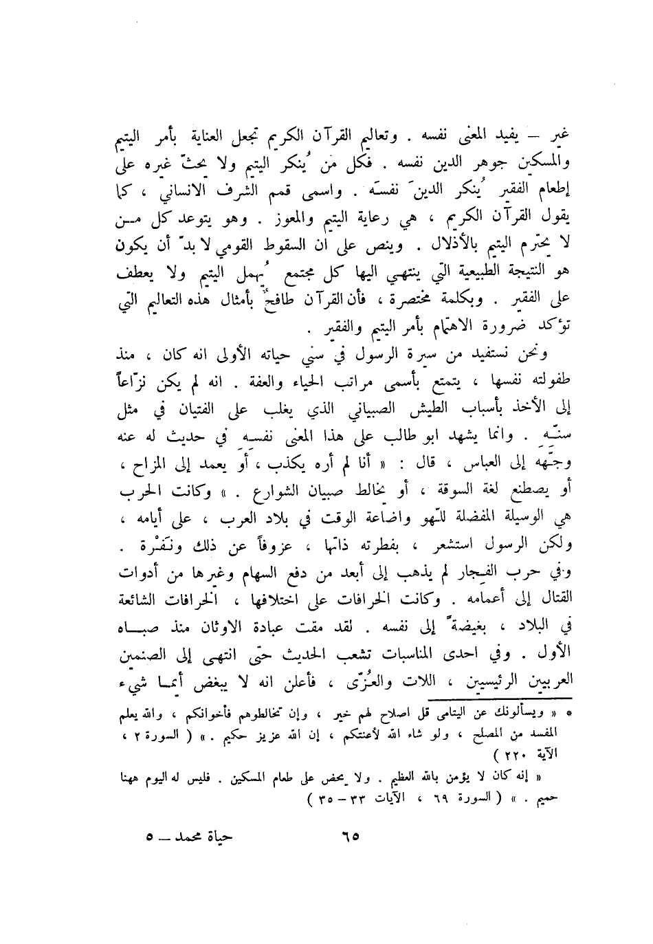 غير- يفيد المعنى نفسه. وتعاليم القرآن الكريم تجعل العناية بأمر اليتيم والمسكين جوهر الدين نفسه. فكل من ينكر اليتيم ولا يحثّ غيره على إطعام الفقير ينكر الدين نفسه. واسمى قمم الشرف الانساني، كما يقول القرآن الكريم، هي رعاية اليتيم* والمعوز. وهو يتوعد كل من لا يحترم اليتيم بالأذلال. وينص على ان السقوط القومي لا بدّ أن يكون هو النتيجة الطبيعية التي ينتهي اليها كل مجتمع يهمل اليتيم ولا يعطف على الفقير. وبكلمة مختصرة، فأن القرآن طافح بأمثال هذه التعاليم التي تؤكد ضرورة الاهتمام بأمر اليتيم والفقير.