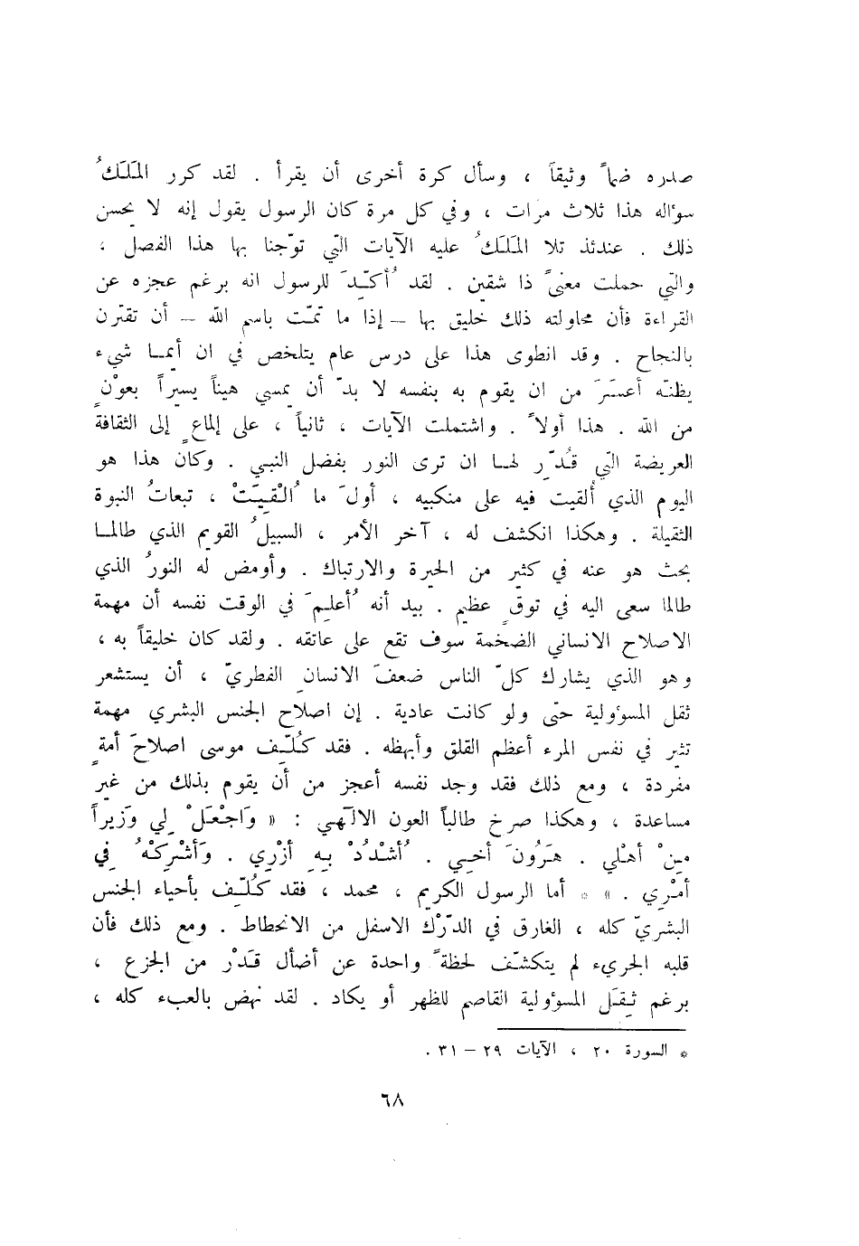 صدره ضما وثيقا، وسأل كرة أخرى أن يقرأ. لقد كرر الملك سؤاله هذا ثلاث مرات، وفي كل مرة كان الرسول يقول إنه لا يحسن ذلك. عندئذ تلا الملك عليه الآيات التي توّجنا بها هذا الفصل، والتي حملت معنى ذا شقين. لقد أكّد للرسول انه برغم عجزه عن القراءة فأن محاولته ذلك خليق بها- إذا ما تمّت باسم الله- أن تقترن بالنجاح. وقد انطوى هذا على درس عام يتلخص في ان أيما شيء يظنّه أعسر من ان يقوم به بنفسه لا بدّ أن يمسي هينا يسيرا بعون من الله. هذا أولا. واشتملت الآيات، ثانيا، على إلماع إلى الثقافة العريضة التي قدّر لها أن ترى النور بفضل النبي. وكان هذا هو اليوم الذي ألقيت فيه على منكبيه، أول ما القيت، تبعات النبوة الثقيلة. وهكذا انكشف له، آخر الأمر، السبيل القويم الذي طالما بحث هو عنه في كثير من الحيرة والارتباك. وأومض له النور الذي طالما سعى اليه في توق عظيم. بيد أنه أعلم في الوقت نفسه أن مهمة الاصلاح الانساني الضخمة سوف تقع على عاتقه. ولقد كان خليقا به، وهو الذي يشارك كلّ الناس ضعف الانسان الفطريّ، أن يستشعر ثقل المسؤولية حتى ولو كانت عادية. إن اصلاح الجنس البشري مهمة تثير في نفس المرء أعظم القلق وأبهظه. فقد كلّف موسى اصلاح أمة مفردة، ومع ذلك فقد وجد نفسه أعجز من أن يقوم بذلك من غير مساعدة، وهكذا صرخ طالبا العون الالهي: «وَاجْعَلْ لِي وَزِيراً مِنْ أَهْلِي. هارُونَ أَخِي. اشْدُدْ بِهِ أَزْرِي. وَأَشْرِكْهُ فِي أَمْرِي.» * أما الرسول الكريم، محمد، فقد كلّف بأحياء الجنس البشريّ كله، الغارق في الدّرك الاسفل من الانحطاط. ومع ذلك فأن قلبه الجريء لم يتكشّف لحظة واحدة عن أضأل قدر من الجزع، برغم ثقل المسؤولية القاصم للظهر أو يكاد. لقد نهض بالعبء كله،