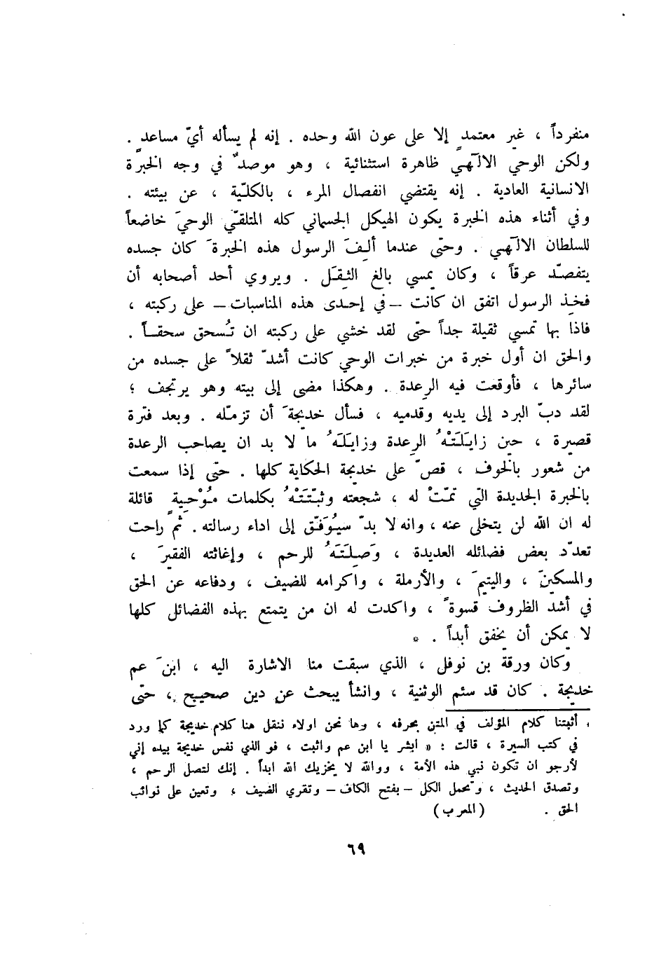 (*) أثبتنا كلام المؤلف في المتن بحرفه، وها نحن اولاء ننقل هنا كلام خديجة كما ورد في كتب السيرة، قالت: «ابشر يا ابن عم واثبت، فو الذي نفس خديجة بيده إني لأرجو ان تكون نبي هذه الأمة، وو الله لا يخزيك الله ابدا. إنك لتصل الرحم، وتصدق الحديث، وتحمل الكل- بفتح الكاف- وتقري الضيف، وتعين على نوائب الحق. (المعرب)