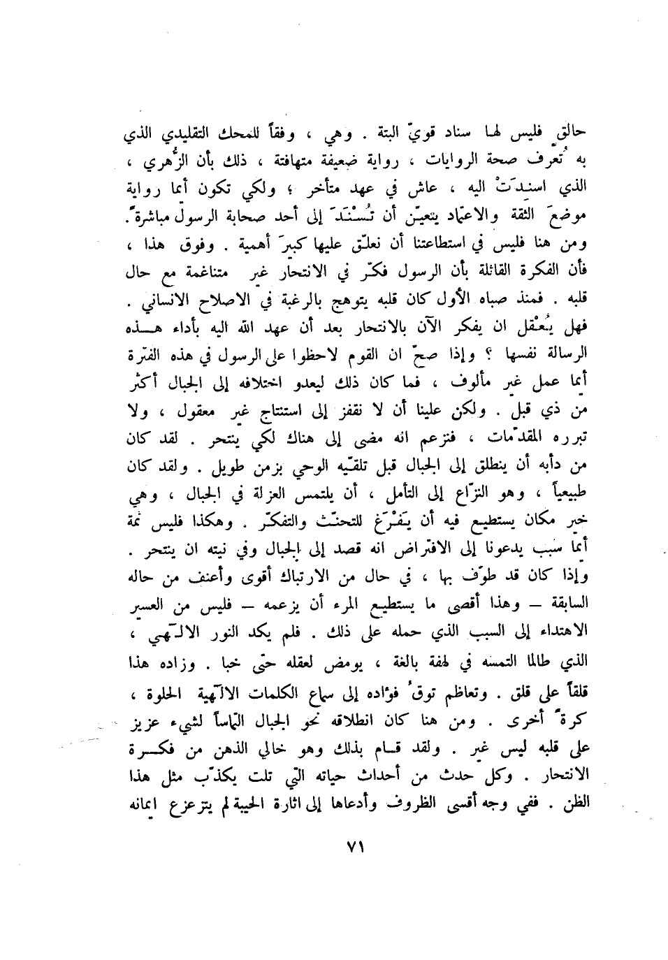 ومن هنا فليس في استطاعتنا أن نعلّق عليها كبير أهمية. وفوق هذا، فأن الفكرة القائلة بأن الرسول فكّر في الانتحار غير متناغمة مع حال قلبه. فمنذ صباه الأول كان قلبه يتوهج بالرغبة في الاصلاح الانساني.