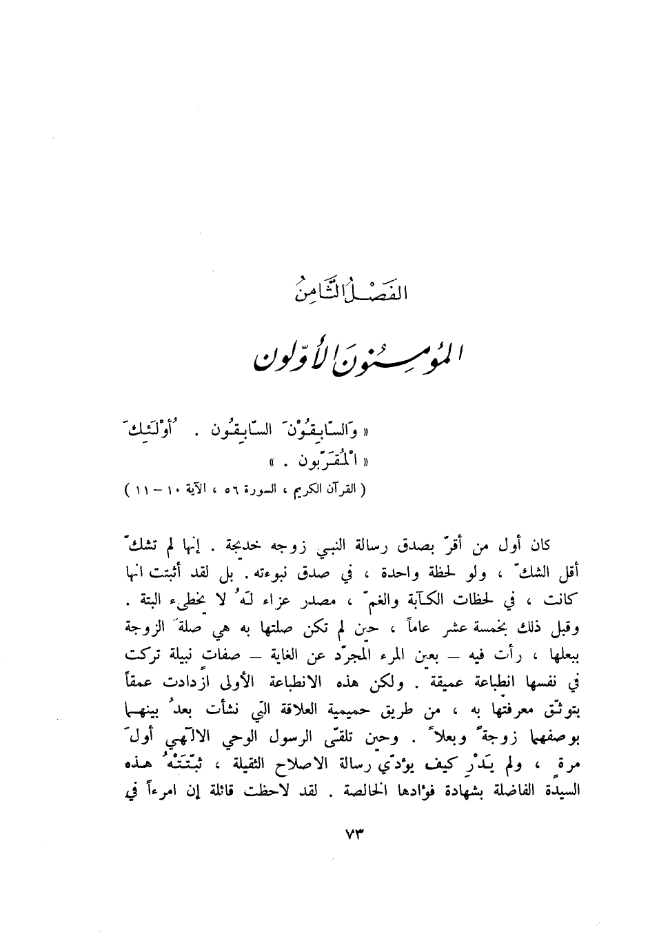 وقبل ذلك بخمسة عشر عاما، حين لم تكن صلتها به هي صلة الزوجة ببعلها، رأت فيه- بعين المرء المجرّد عن الغاية- صفات نبيلة تركت في نفسها انطباعة عميقة. ولكن هذه الانطباعة الأولى ازدادت عمقا بتوثّق معرفتها به، من طريق حميمية العلاقة التي نشأت بعد بينهما بوصفهما زوجة وبعلا. وحين تلقّى الرسول الوحي الالهي أول مرة، ولم يدر كيف يؤدّي رسالة الاصلاح الثقيلة، ثبّتته هذه السيدة الفاضلة بشهادة فؤادها الخالصة. لقد لاحظت قائلة إن امرآ في