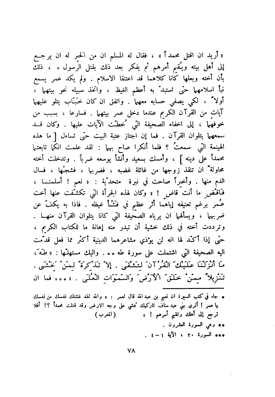 وترددت أخته في ذلك خشية أن تبدر منه إهانة ما للكتاب الكريم، حتى إذا أكّد لها انه لن يؤذي مشاعرهما الدينية أكثر مما فعل قدّمت اليه الصحيفة التي اشتملت على سورة طه**. واليك مستهلّها: «طه، ما أَنْزَلْنا عَلَيْكَ الْقُرْآنَ لِتَشْقى. إِلَّا تَذْكِرَةً لِمَنْ يَخْشى.