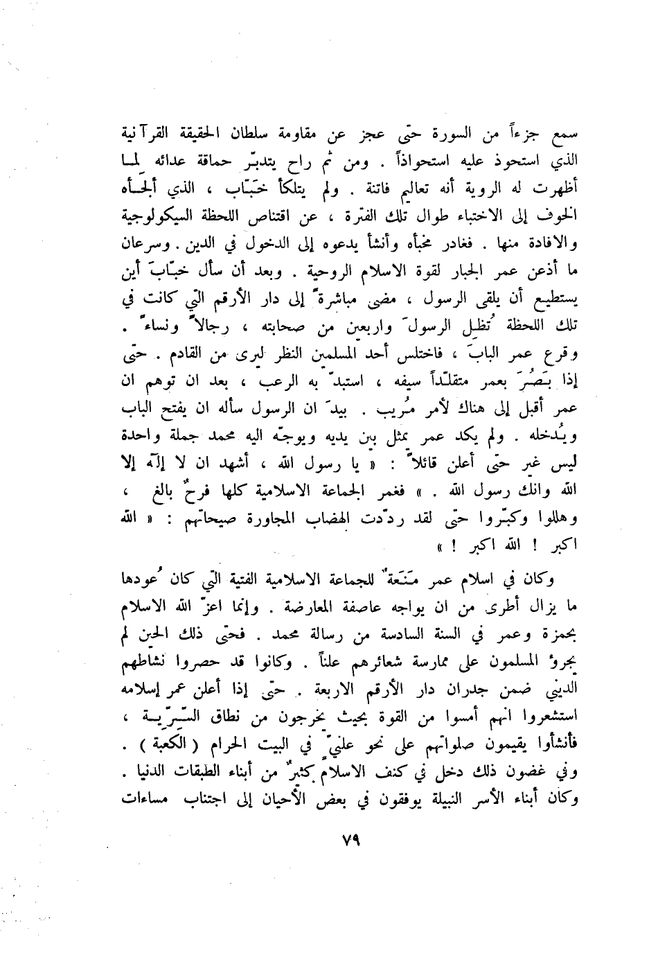 وقرع عمر الباب، فاختلس أحد المسلمين النظر ليرى من القادم. حتى إذا بصر بعمر متقلّدا سيفه، استبدّ به الرعب، بعد ان توهم ان عمر أقبل إلى هناك لأمر مريب. بيد ان الرسول سأله ان يفتح الباب ويدخله. ولم يكد عمر يمثل بين يديه ويوجّه اليه محمد جملة واحدة ليس غير حتى أعلن قائلا: «يا رسول الله، أشهد ان لا إله إلا الله وانك رسول الله.» فغمر الجماعة الاسلامية كلها فرح بالغ، وهللوا وكبّروا حتى لقد ردّدت الهضاب المجاورة صيحاتهم: «الله اكبر! الله اكبر!»