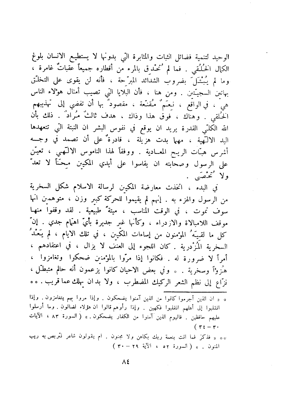(**) «فَذَكِّرْ فَما أَنْتَ بِنِعْمَةِ رَبِّكَ بِكاهِنٍ وَلا مَجْنُونٍ. أَمْ يَقُولُونَ شاعِرٌ نَتَرَبَّصُ بِهِ رَيْبَ الْمَنُونِ.» (السورة 52، الآية 29- 30)
