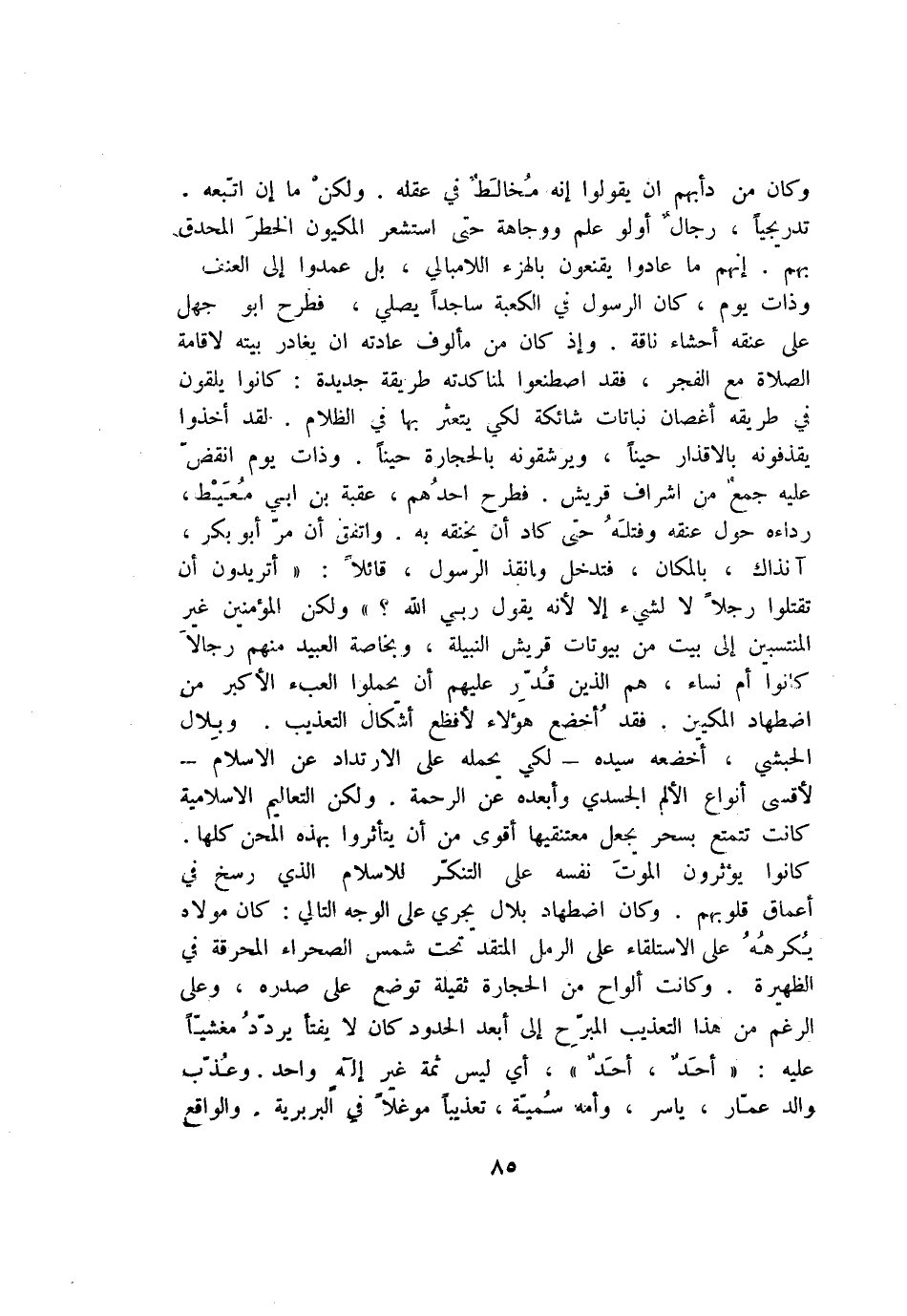 كانوا يؤثرون الموت نفسه على التنكّر للاسلام الذي رسخ في أعماق قلوبهم. وكان اضطهاد بلال يجري على الوجه التالي: كان مولاه يكرهه على الاستلقاء على الرمل المتقد تحت شمس الصحراء المحرقة في الظهيرة. وكانت ألواح من الحجارة ثقيلة توضع على صدره، وعلى الرغم من هذا التعذيب المبرّح إلى أبعد الحدود كان لا يفتأ يردّد مغشيّا عليه: «أحد، أحد» ، أي ليس ثمة غير إله واحد. وعذّب والد عمّار، ياسر، وأمه سميّة، تعذيبا موغلا في البربرية. والواقع