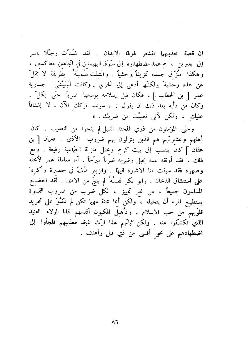 ان قصة تعذيبهما تقشعر لهولها الابدان- لقد شدّت رجلا ياسر إلى بعيرين، ثم عمد مضطهدوه إلى سوق البهيمتين في اتجاهين معاكسين، وهكذا مزّق جسده تمزيقا وحشيا. وقتلت سميّة بطريقة لا تقلّ عن هذه وحشية ولكنّها أدعى إلى الخزي. وكانت لبينى جارية عمر [بن الخطاب] ، فكان قبل إسلامه يوسعها ضربا حتى يكلّ.