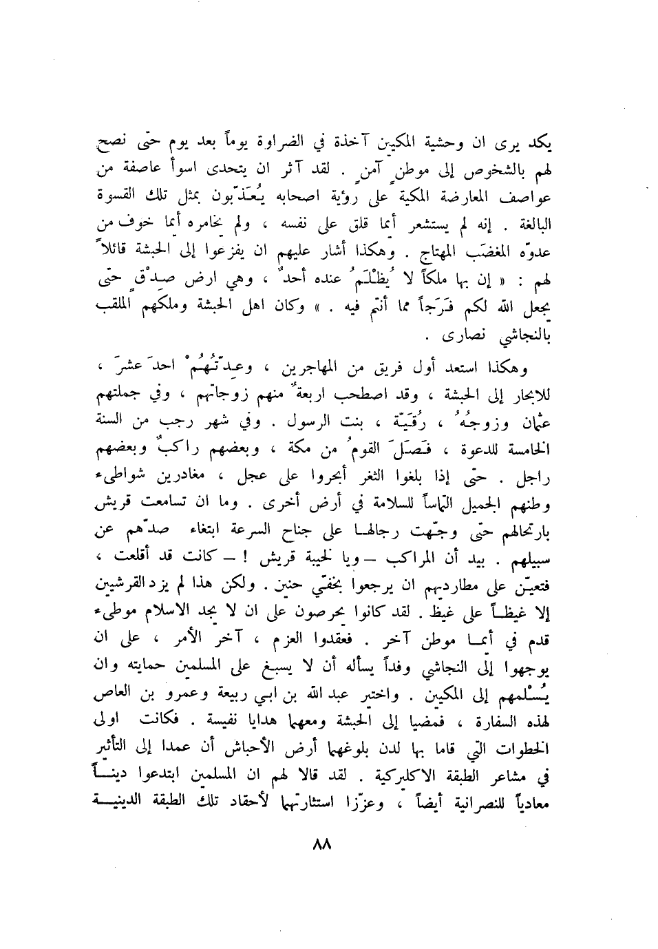 وهكذا استعد أول فريق من المهاجرين، وعدّتهم احد عشر، للابحار إلى الحبشة، وقد اصطحب اربعة منهم زوجاتهم، وفي جملتهم عثمان وزوجه، رقيّة، بنت الرسول. وفي شهر رجب من السنة الخامسة للدعوة، فصل القوم من مكة، وبعضهم راكب وبعضهم راجل. حتى إذا بلغوا الثغر أبحروا على عجل، مغادرين شواطئ وطنهم الجميل التماسا للسلامة في أرض أخرى. وما ان تسامعت قريش بارتحالهم حتى وجّهت رجالها على جناح السرعة ابتغاء صدّهم عن سبيلهم. بيد أن المراكب- ويا لخيبة قريش! - كانت قد أقلعت، فتعيّن على مطارديهم ان يرجعوا بخفّي حنين. ولكن هذا لم يزد القرشيين إلا غيظا على غيظ. لقد كانوا يحرصون على ان لا يجد الاسلام موطئ قدم في أيما موطن آخر. فعقدوا العزم، آخر الأمر، على ان يوجهوا إلى النجاشي وفدا يسأله أن لا يسبغ على المسلمين حمايته وان يسلمهم إلى المكيين. واختير عبد الله بن ابي ربيعة وعمرو بن العاص لهذه السفارة، فمضيا إلى الحبشة ومعهما هدايا نفيسة. فكانت اولى الخطوات التي قاما بها لدن بلوغهما أرض الأحباش أن عمدا إلى التأثير في مشاعر الطبقة الاكليركية. لقد قالا لهم ان المسلمين ابتدعوا دينا معاديا للنصرانية أيضا، وعزّزا استثارتهما لأحقاد تلك الطبقة الدينية