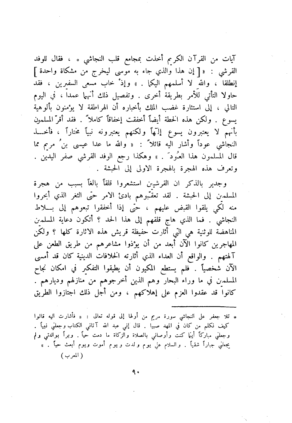 (*) تلا جعفر على النجاشي سورة مريم من أولها إلى قوله تعالى: «فأشارت اليه قالوا كيف نكلم من كان في المهد صبيا. قال إني عبد الله آتاني الكتاب وجعلني نبيا. وجعلني مباركا أينما كنت وأوصاني بالصلاة والزكاة ما دمت حيا. وبرا بوالدتي ولم يجعلني جبارا شقيا. والسلام علي يوم ولدت ويوم أموت ويوم أبعث حيا.» (المعرب)