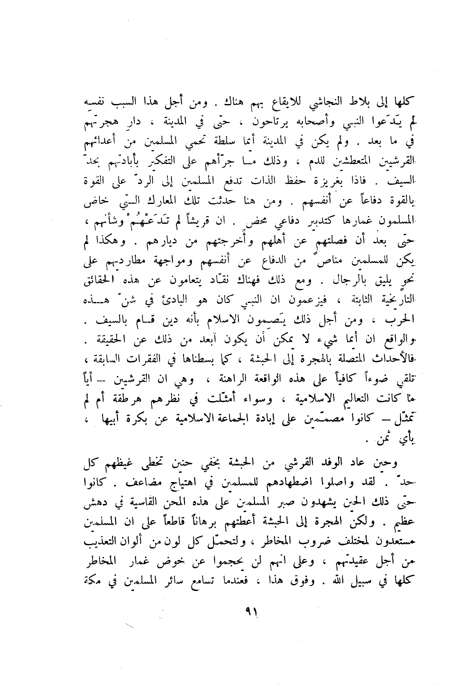 كلها إلى بلاط النجاشي للايقاع بهم هناك. ومن أجل هذا السبب نفسه لم يدعوا النبي وأصحابه يرتاحون، حتى في المدينة، دار هجرتهم في ما بعد. ولم يكن في المدينة أيما سلطة تحمي المسلمين من أعدائهم القرشيين المتعطشين للدم، وذلك ما جرّأهم على التفكير بأبادتهم بحدّ السيف. فاذا بغريزة حفظ الذات تدفع المسلمين إلى الردّ على القوة بالقوة دفاعا عن أنفسهم. ومن هنا حدثت تلك المعارك التي خاض المسلمون غمارها كتدبير دفاعي محض. ان قريشا لم تدعهم وشأنهم، حتى بعد أن فصلتهم عن أهلهم وأخرجتهم من ديارهم. وهكذا لم يكن للمسلمين مناص من الدفاع عن أنفسهم ومواجهة مطارديهم على نحو يليق بالرجال. ومع ذلك فهناك نقّاد يتعامون عن هذه الحقائق التاريخية الثابتة، فيزعمون ان النبي كان هو البادئ في شنّ هذه الحرب، ومن أجل ذلك يصمون الاسلام بأنه دين قام بالسيف.