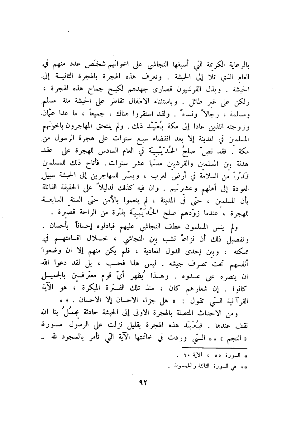 وزوجته اللذين عادا إلى مكة بعيد ذلك. ولم يلتحق المهاجرون باخوانهم المسلمين في المدينة إلا بعد انقضاء سبع سنوات على هجرة الرسول من مكة. فقد نصّ صلح الحديبية في العام السادس للهجرة على عقد هدنة بين المسلمين والقرشيين مدتها عشر سنوات. فأتاح ذلك للمسلمين قدرا من السلامة في أرض العرب، ويسّر للمهاجرين إلى الحبشة سبيل العودة إلى أهلهم وعشيرتهم. وان فيه كذلك لدليلا على الحقيقة القائلة بأن المسلمين، حتى في المدينة، لم ينعموا بالأمن حتى السنة السابعة للهجرة، عندما زوّدهم صلح الحديبية بفترة من الراحة قصيرة.