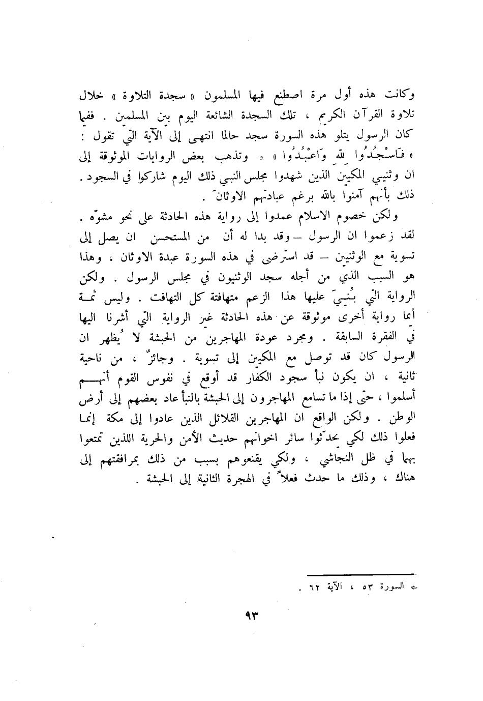 لقد زعموا ان الرسول- وقد بدا له أن من المستحسن ان يصل إلى تسوية مع الوثنيين- قد استرضى في هذه السورة عبدة الاوثان، وهذا هو السبب الذي من أجله سجد الوثنيون في مجلس الرسول. ولكن الروآية التي بني عليها هذا الزعم متهافتة كل التهافت. وليس ثمة أيما روآية أخرى موثوقة عن هذه الحادثة غير الروآية التي أشرنا اليها في الفقرة السابقة. ومجرد عودة المهاجرين من الحبشة لا يظهر ان الرسول كان قد توصل مع المكيين إلى تسوية. وجائز، من ناحية ثانية، ان يكون نبأ سجود الكفار قد أوقع في نفوس القوم أنهم أسلموا، حتى إذا ما تسامع المهاجرون إلى الحبشة بالنبأ عاد بعضهم إلى أرض الوطن. ولكن الواقع ان المهاجرين القلائل الذين عادوا إلى مكة إنما فعلوا ذلك لكي يحدّثوا سائر اخوانهم حديث الأمن والحرية اللذين تمتعوا بهما في ظل النجاشي، ولكي يقنعوهم بسبب من ذلك بمرافقتهم إلى هناك، وذلك ما حدث فعلا في الهجرة الثانية إلى الحبشة.