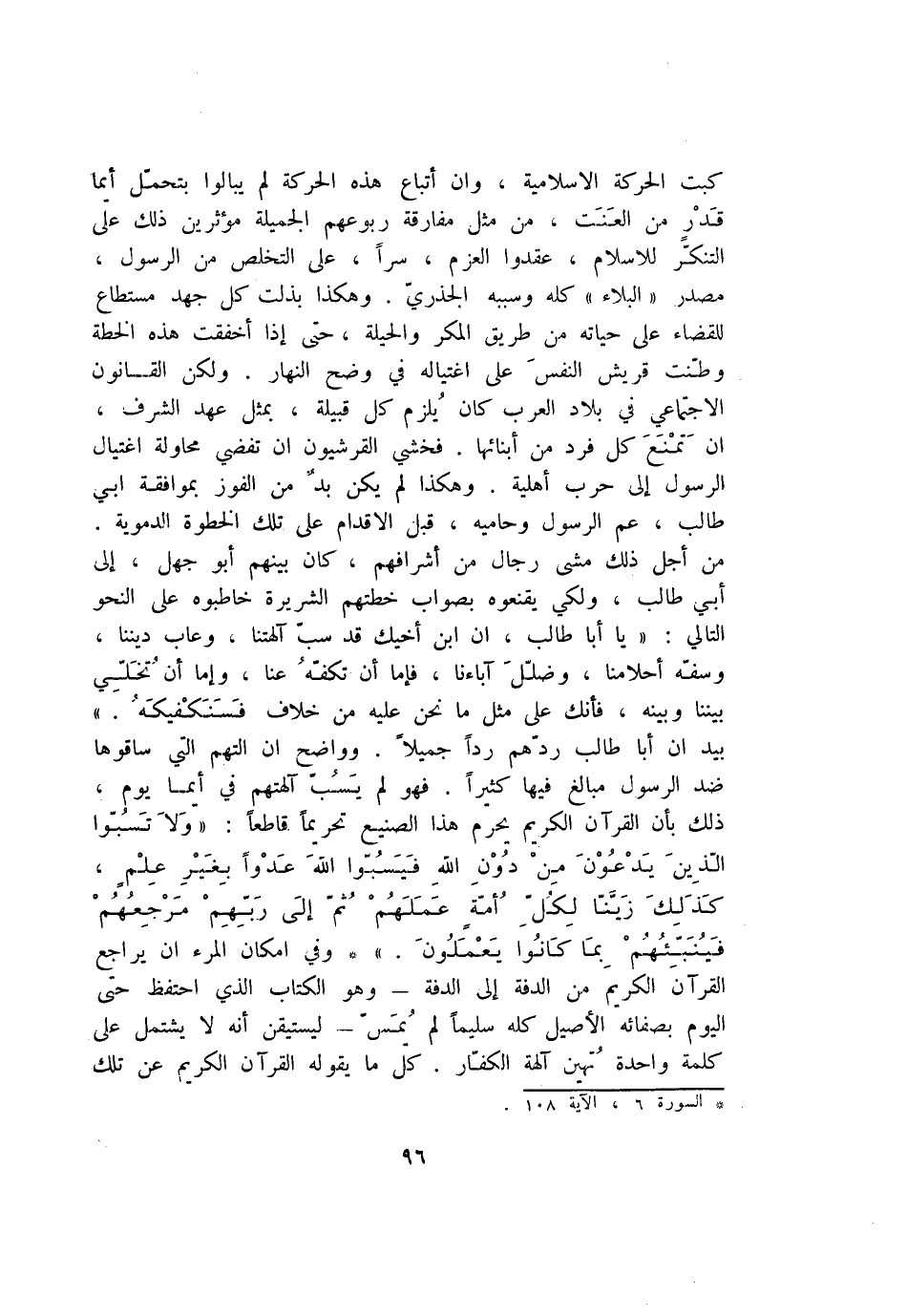 بيد ان أبا طالب ردّهم ردا جميلا. وواضح ان التهم التي ساقوها ضد الرسول مبالغ فيها كثيرا. فهو لم يسبّ آلهتم في أيما يوم، ذلك بأن القرآن الكريم يحرم هذا الصنيع تحريما قاطعا: «وَلا تَسُبُّوا الَّذِينَ يَدْعُونَ مِنْ دُونِ اللَّهِ فَيَسُبُّوا اللَّهَ عَدْواً بِغَيْرِ عِلْمٍ، كَذلِكَ زَيَّنَّا لِكُلِّ أُمَّةٍ عَمَلَهُمْ ثُمَّ إِلى رَبِّهِمْ مَرْجِعُهُمْ فَيُنَبِّئُهُمْ بِما كانُوا يَعْمَلُونَ.» * وفي امكان المرء ان يراجع القرآن الكريم من الدفة إلى الدفة- وهو الكتاب الذي احتفظ حتى اليوم بصفائه الأصيل كله سليما لم يمسّ- ليستيقن أنه لا يشتمل على كلمة واحدة تهين آلهة الكفّار. كلّ ما يقوله القرآن الكريم عن تلك