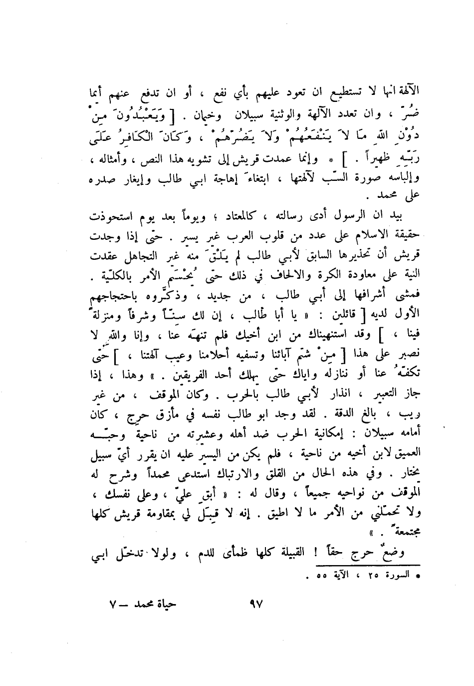الآلهة انها لا تستطيع ان تعود عليهم بأي نفع، أو ان تدفع عنهم أيما ضرّ، وان تعدد الآلهة والوثنية سبيلان وخيمان. [وَيَعْبُدُونَ مِنْ دُونِ اللَّهِ ما لا يَنْفَعُهُمْ وَلا يَضُرُّهُمْ، وَكانَ الْكافِرُ عَلى رَبِّهِ ظَهِيراً.] * وإنما عمدت قريش إلى تشويه هذا النص، وأمثاله، وإلباسه صورة السّب لآلهتها، ابتغاء إهاجة ابي طالب وإيغار صدره على محمد.