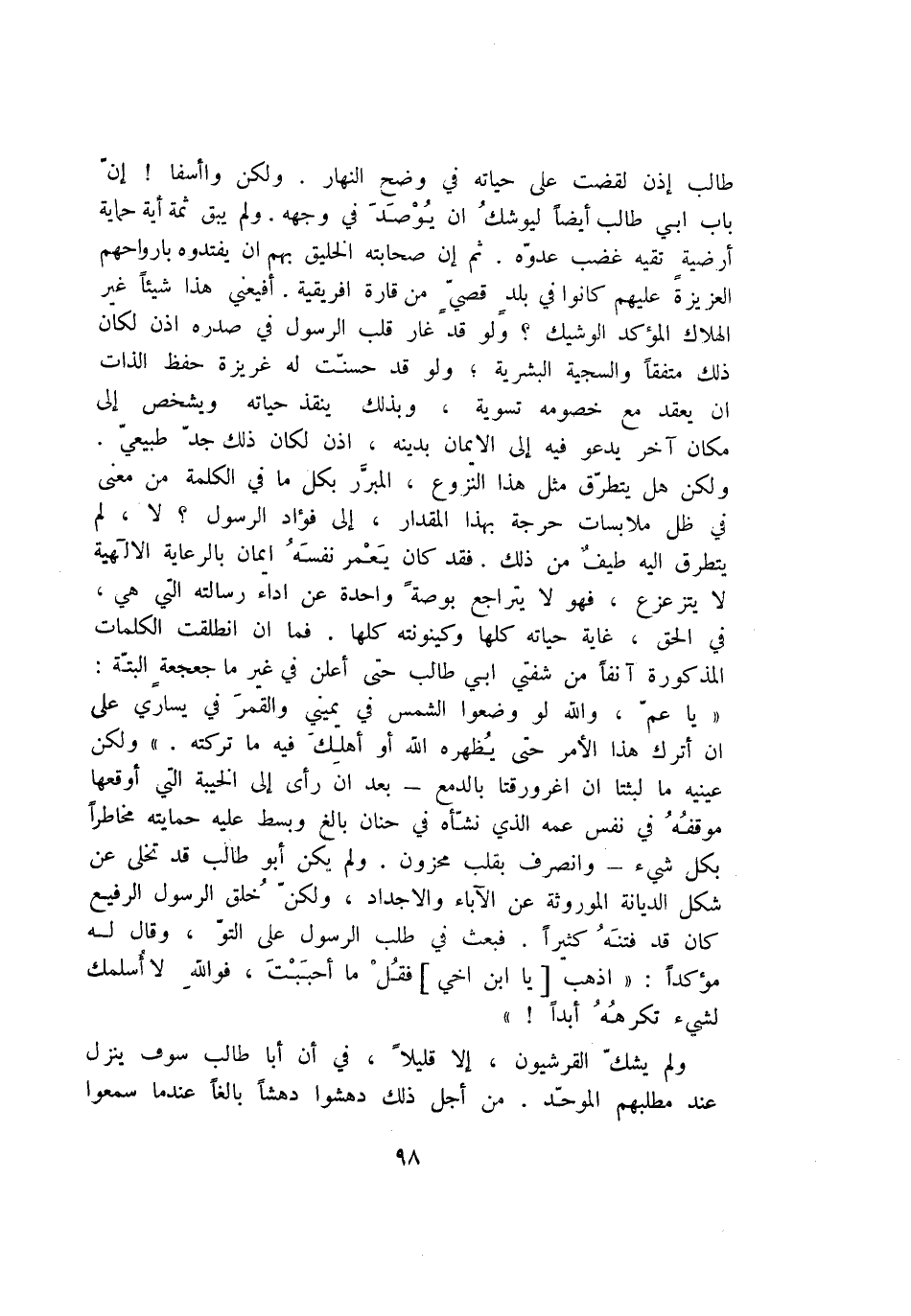 طالب إذن لقضت على حياته في وضح النهار. ولكن وا أسفا! إنّ باب ابي طالب أيضا ليوشك ان يوصد في وجهه. ولم يبق ثمة أية حماية أرضية تقية غضب عدوّه. ثم إن صحابته الخليق بهم ان يفتدوه بارواحهم العزيزة عليهم كانوا في بلد قصيّ من قارة افريقية. أفيعني هذا شيئا غير الهلاك المؤكد الوشيك؟ ولو قد غار قلب الرسول في صدره اذن لكان ذلك متفقا والسجية البشرية؛ ولو قد حسنّت له غريزة حفظ الذات ان يعقد مع خصومه تسوية، وبذلك ينقذ حياته ويشخص إلى مكان آخر يدعو فيه إلى الايمان بدينه، اذن لكان ذلك جدّ طبيعيّ.