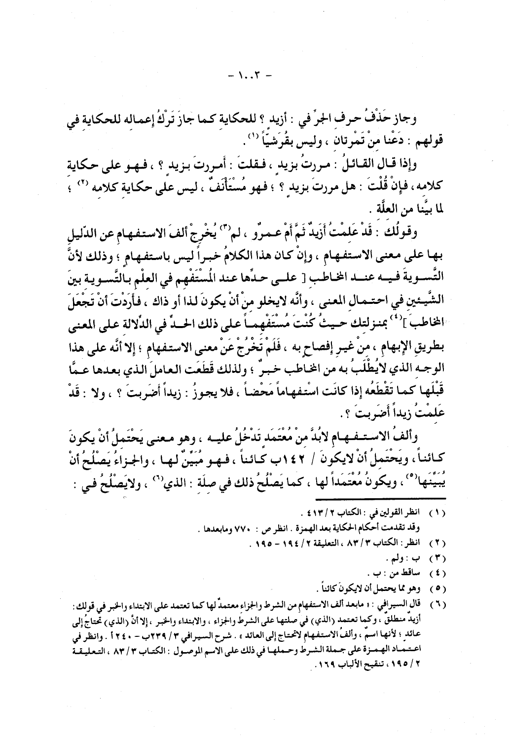 وجاز حذف حرف الجر في: أزيد؟ للحكاية كما جاز ترك إعماله للحكاية في قولهم: دعنا من تمرتان, وليس بقرشيًا.
